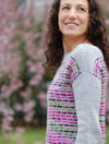 Designed to help you use up a skein or two of variegated sock yarn, this top-down, drop shouldered pullover only looks like it’s stranded knitting. In reality, you only ever use 1 color on any row, and slip a stitch here and there to make it look like stranded colorwork.