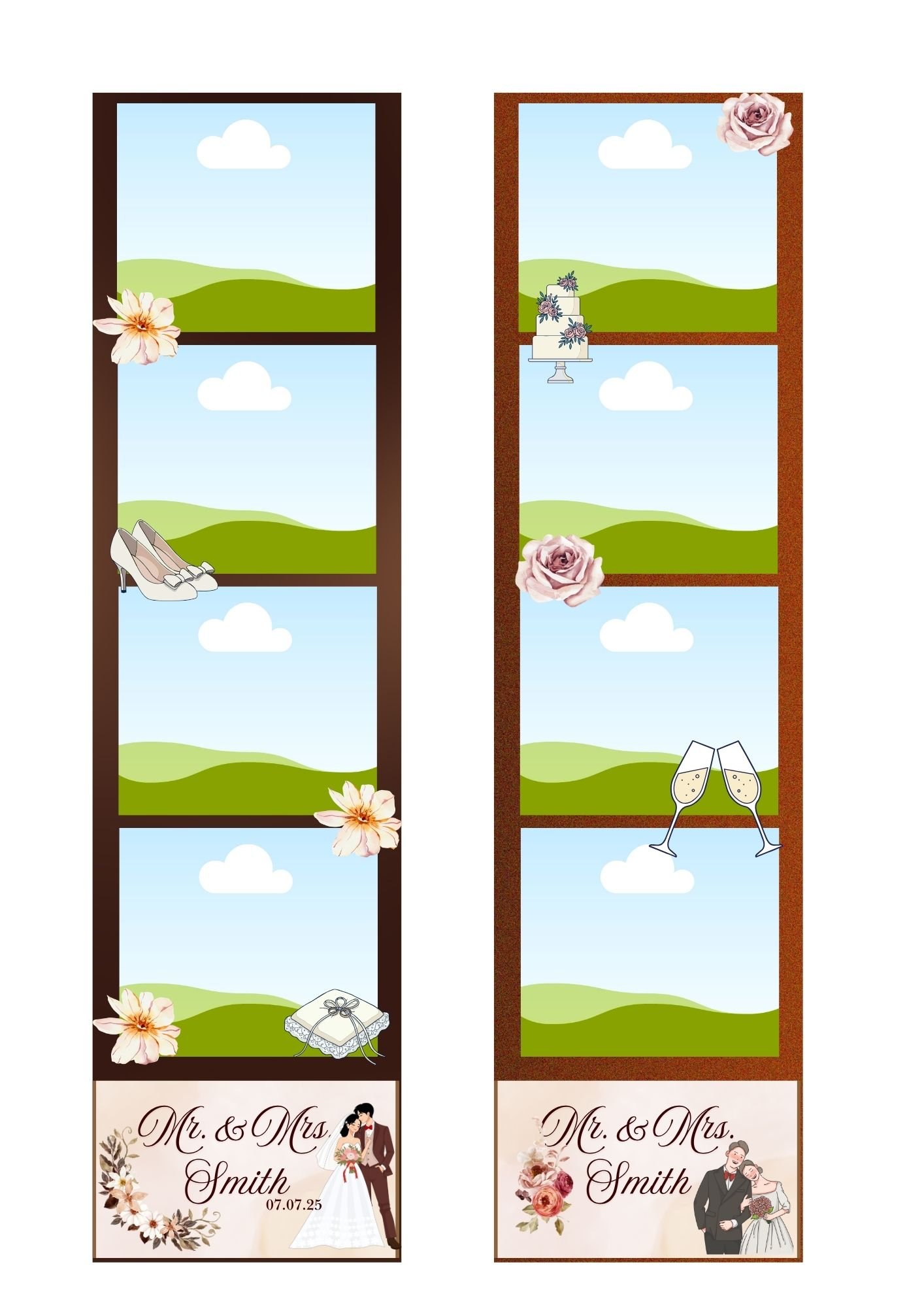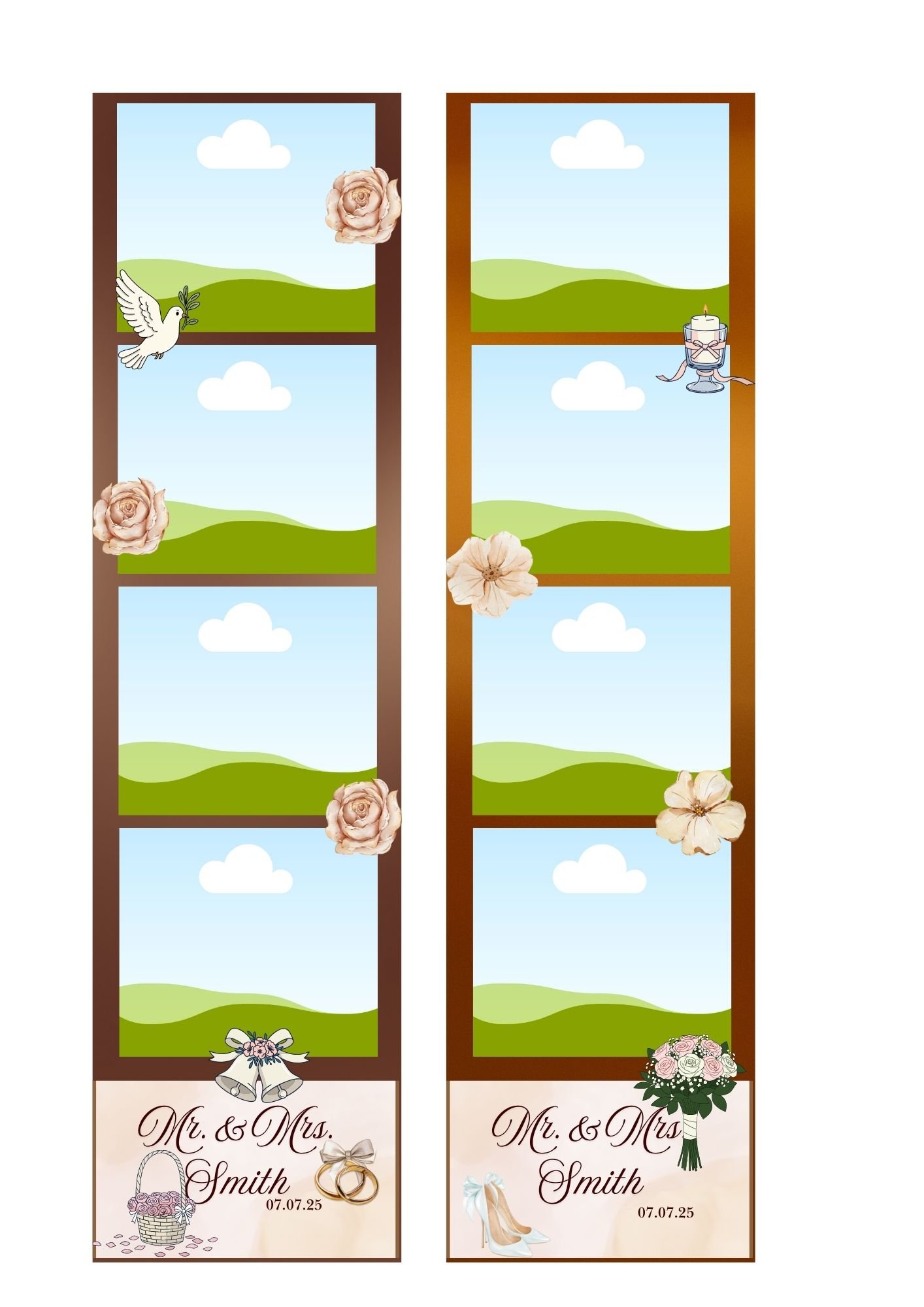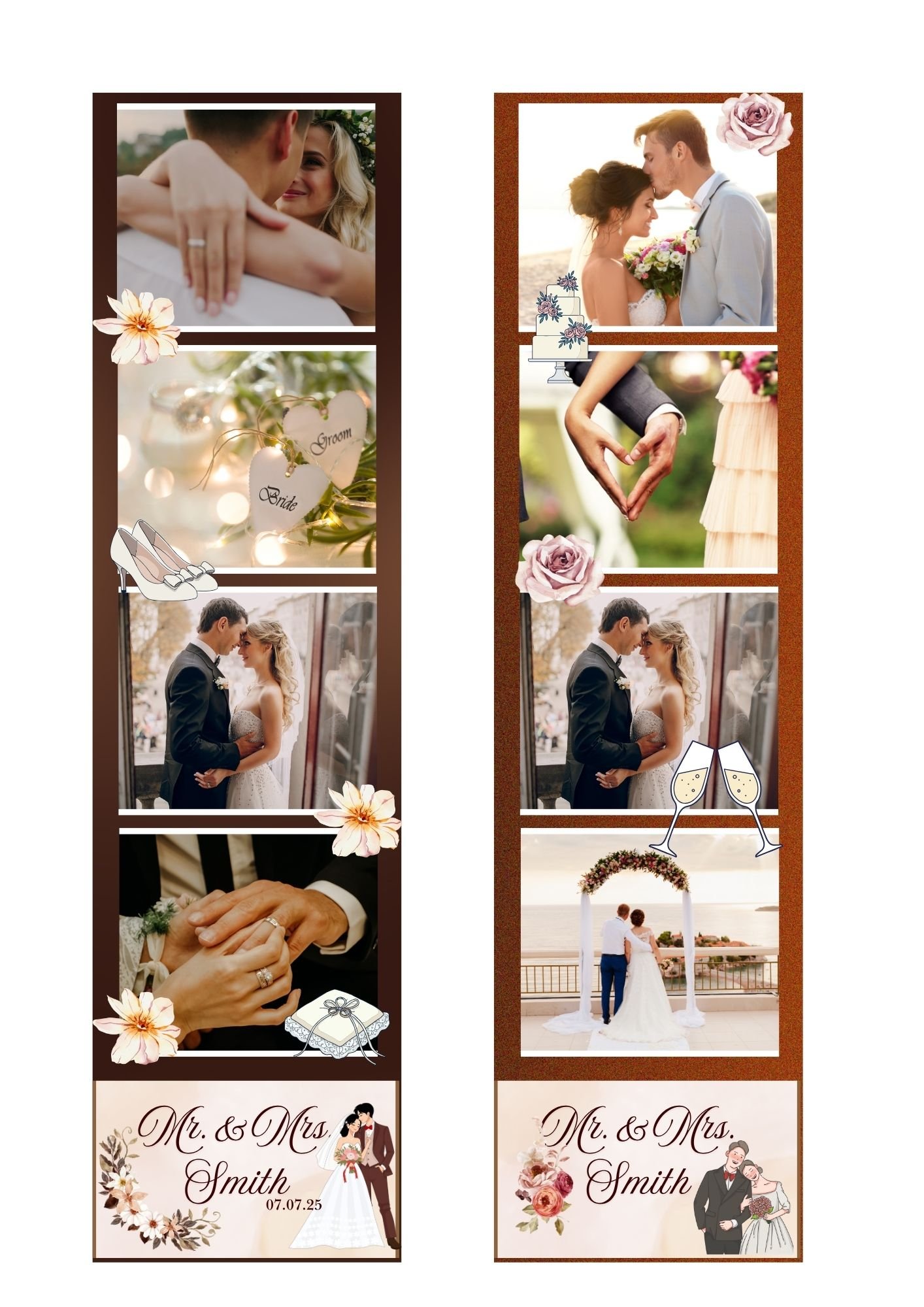 This bundle features two distinct vertical photo strip designs, perfectly sized for modern photo booth prints or sharing on social media. Each template includes four stacked photo placeholders and a customizable footer area, complete with beautiful illustrations for the "Mr. & Mrs. Smith" title and event date.