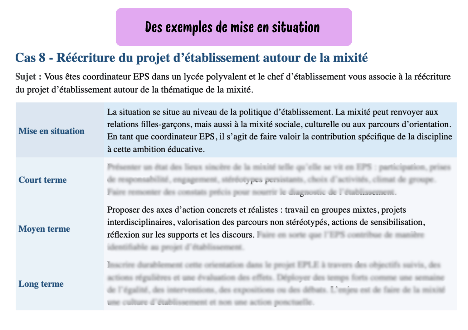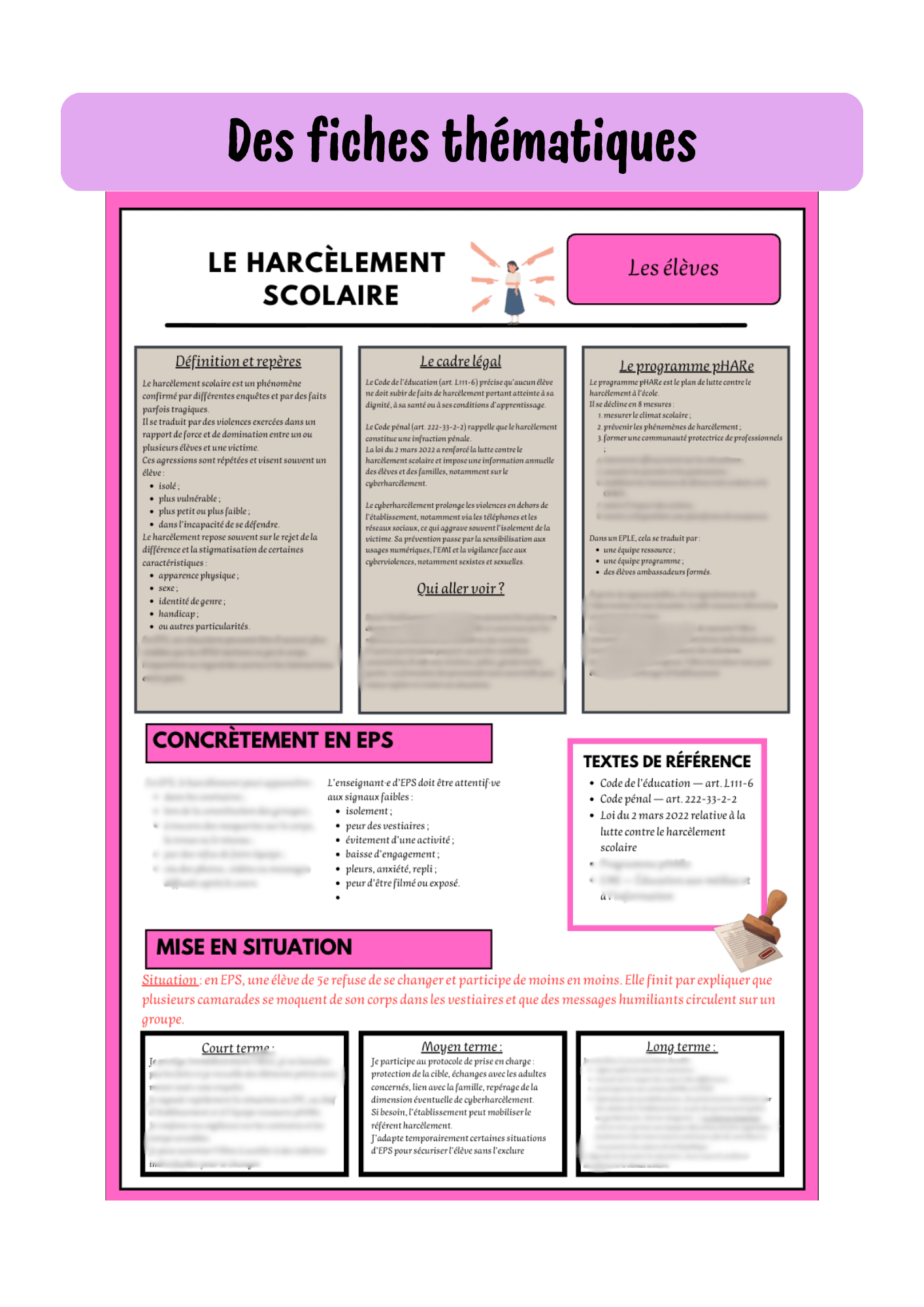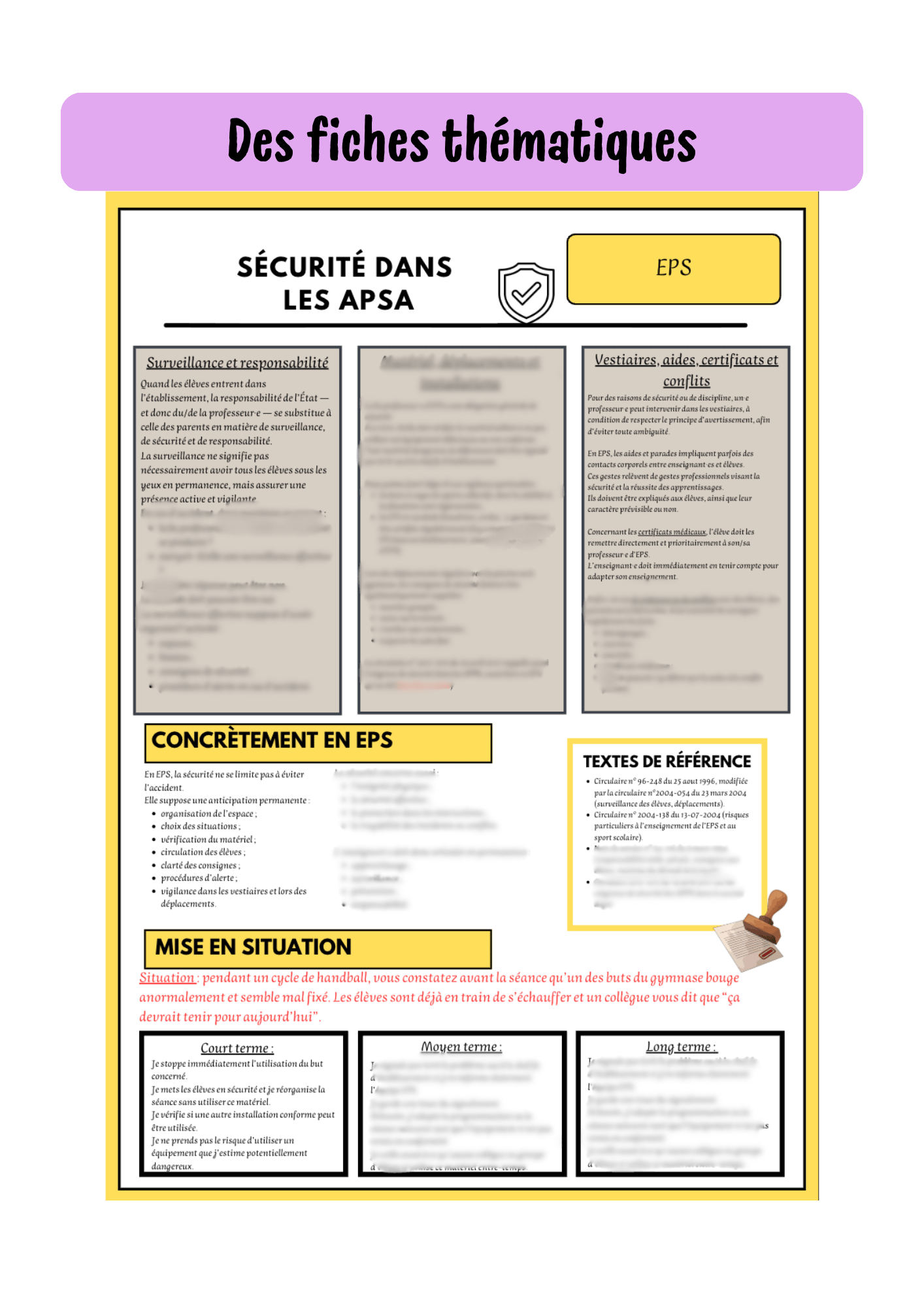- Une fiche par thématique (sécurité, harcèlement, missions de l'enseignant, textes qui régissent l'EPS...)