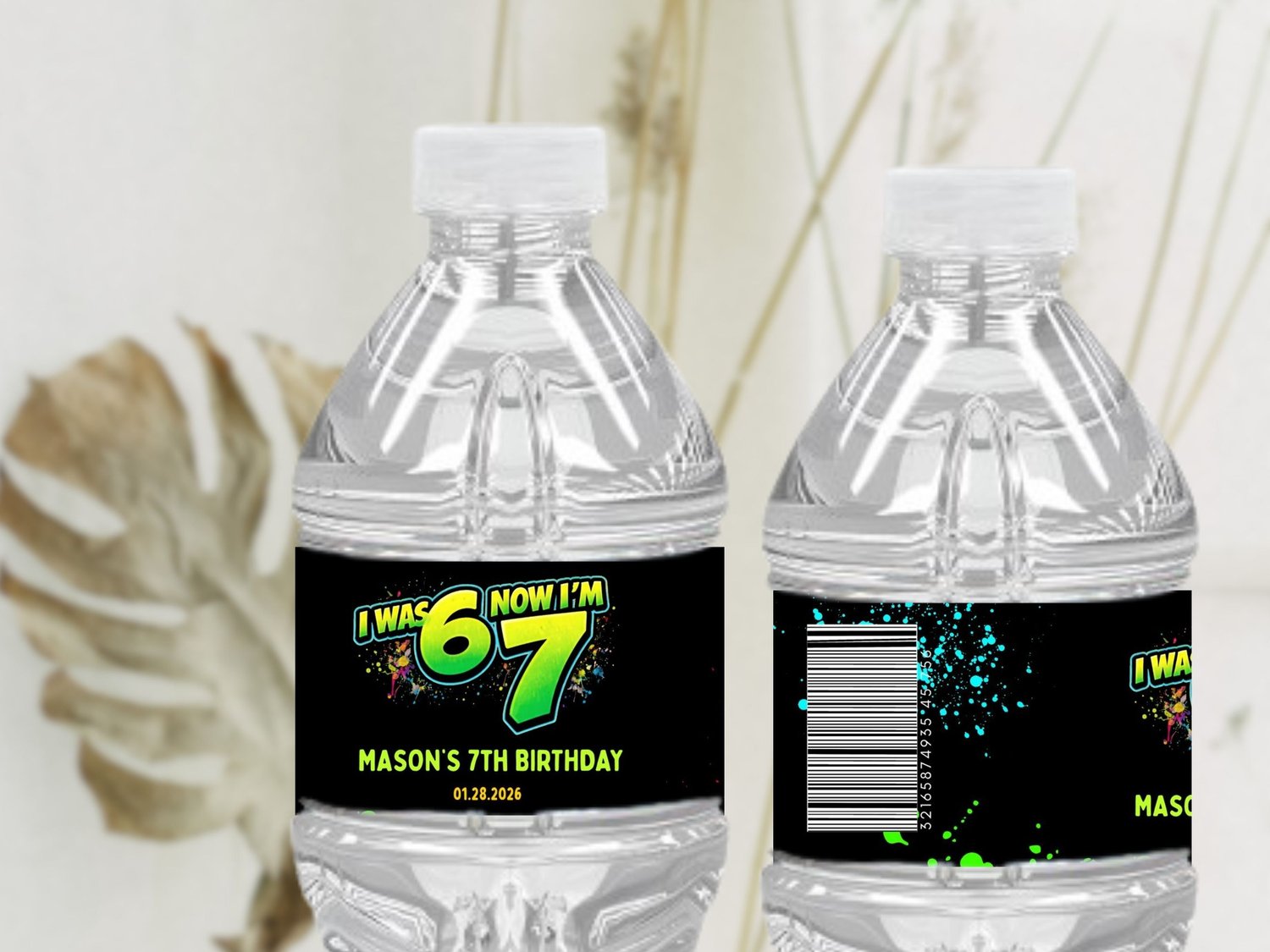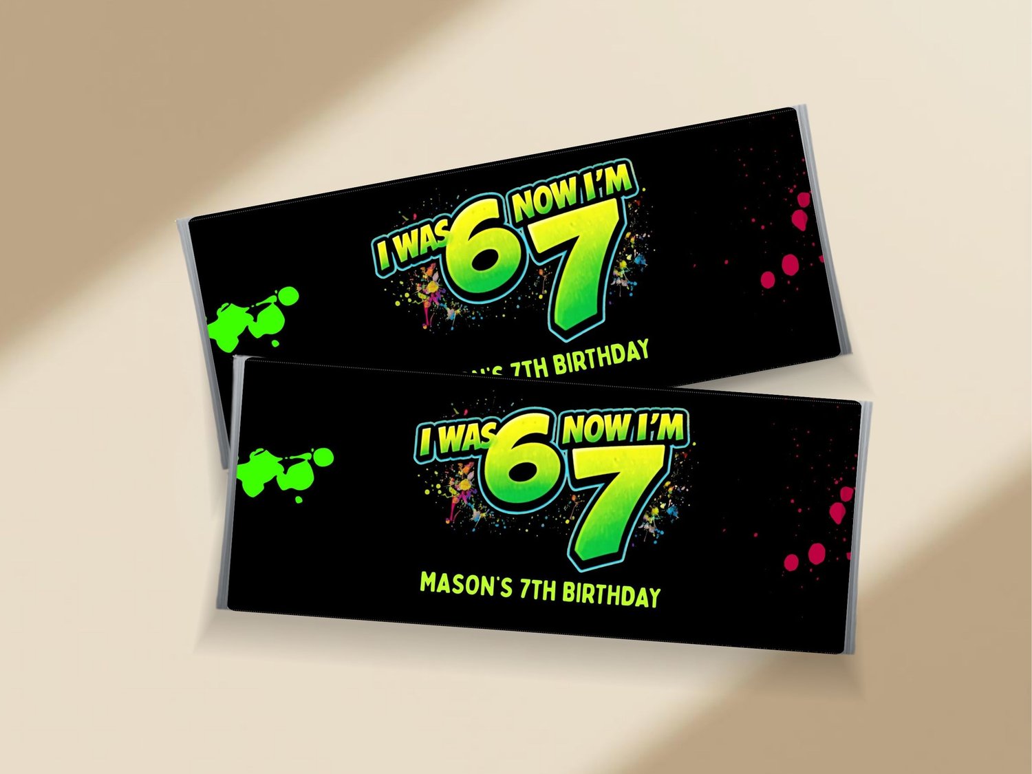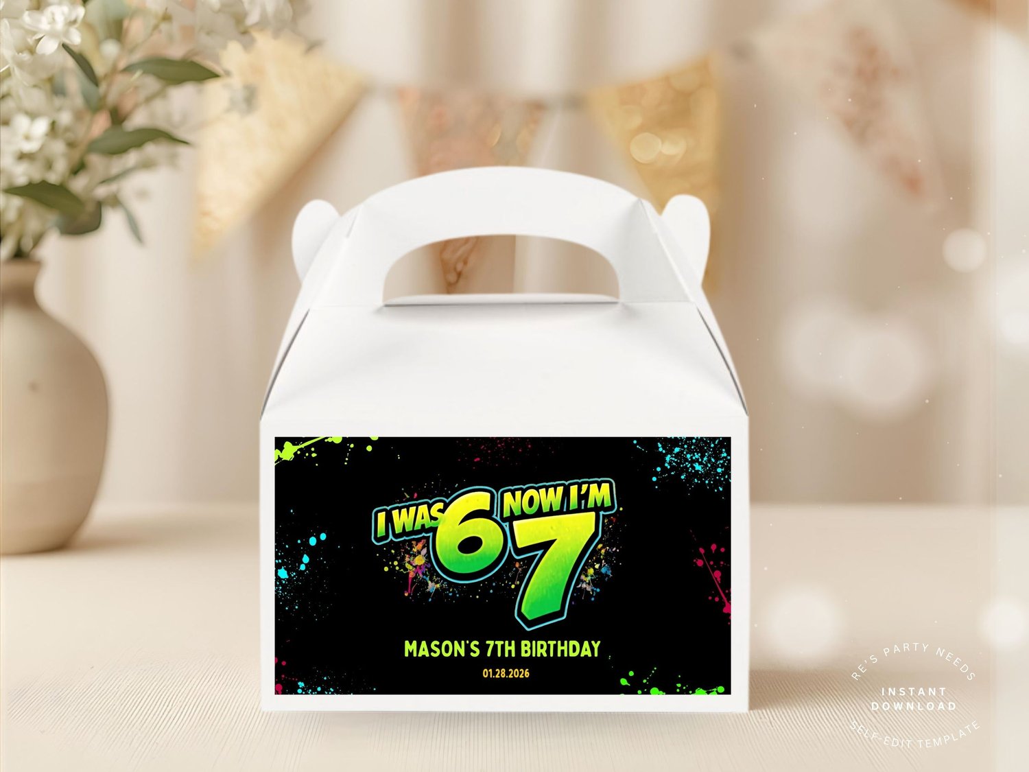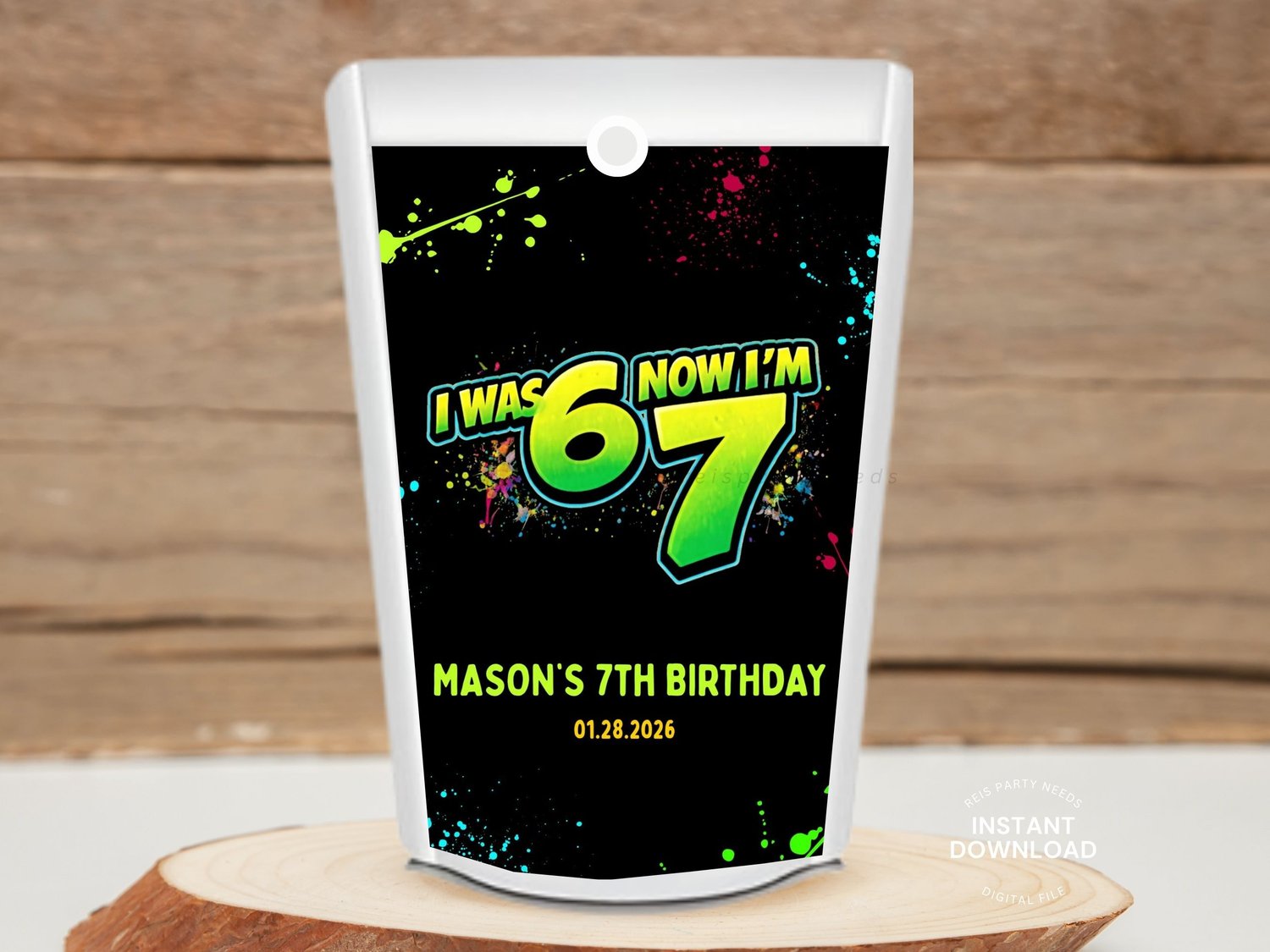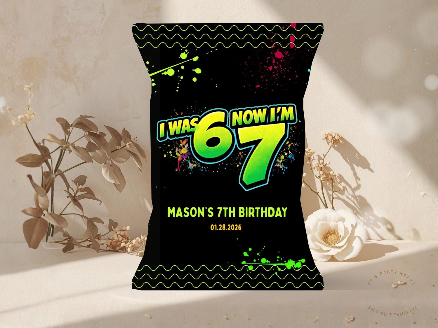 Six Seven 6 7 Neon Graffiti Birthday Kit, 7th Birthday Editable Chip Bag, Water Label, Favor Box, Pizza Box, Label Printable Template