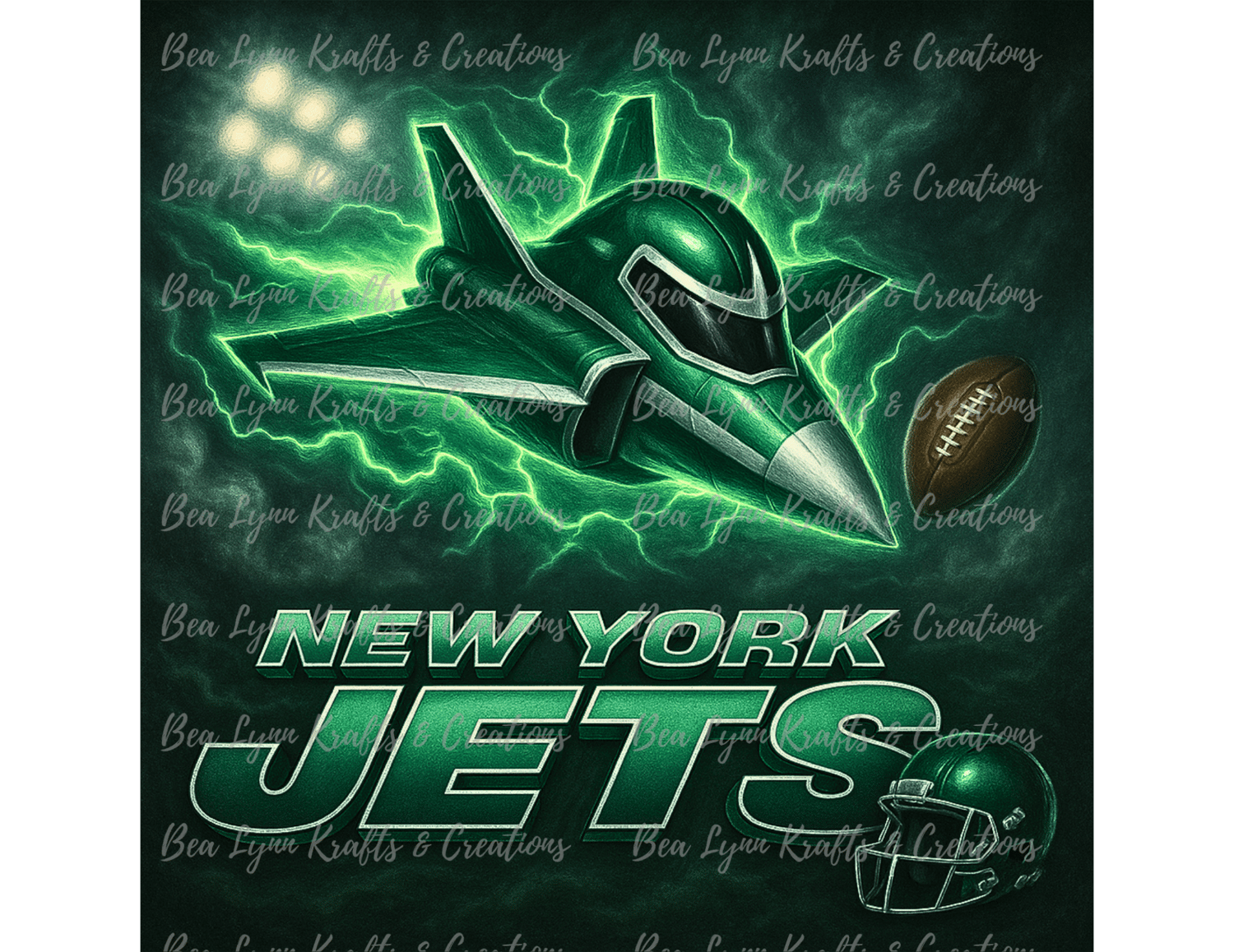 Beneath the scene, the bold “NEW YORK JETS” lettering appears in metallic green and white, giving the design a polished, professional game-day look. A football helmet sits at the lower edge, completing the perfect fan art composition. Delivered as a high-resolution transparent PNG, this file is ideal for sublimation artists, sports boutiques, Jets fans, and makers crafting premium NFL-inspired products.