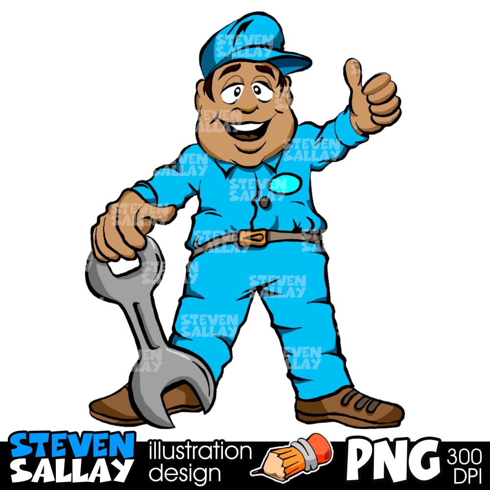 Mechanic Clip Art - Ethnic Auto Mechanic Holding a Wrench - Technician - PNG - Sublimation - Cartoon - Digital Download - Commercial Use.