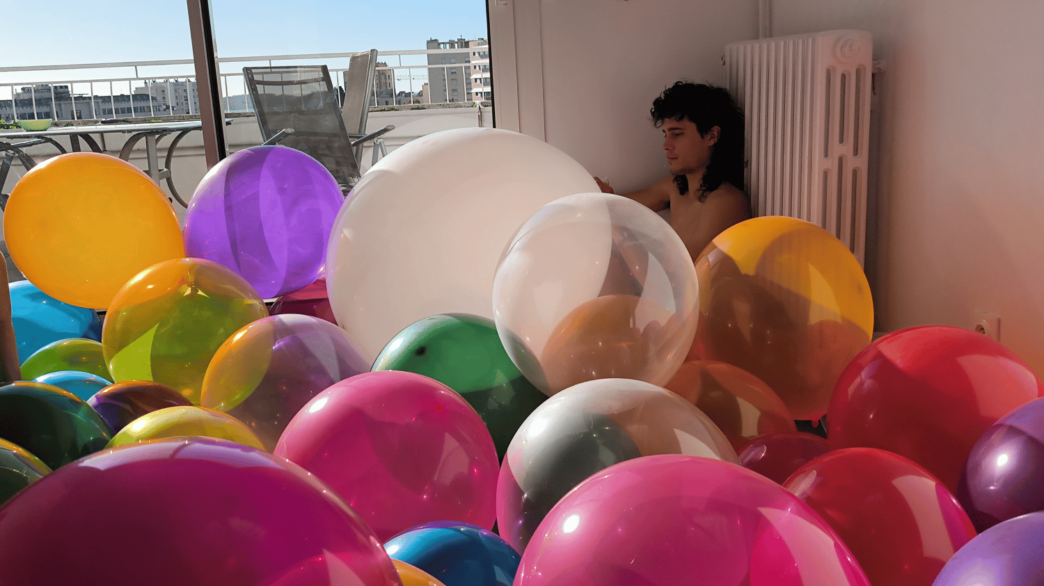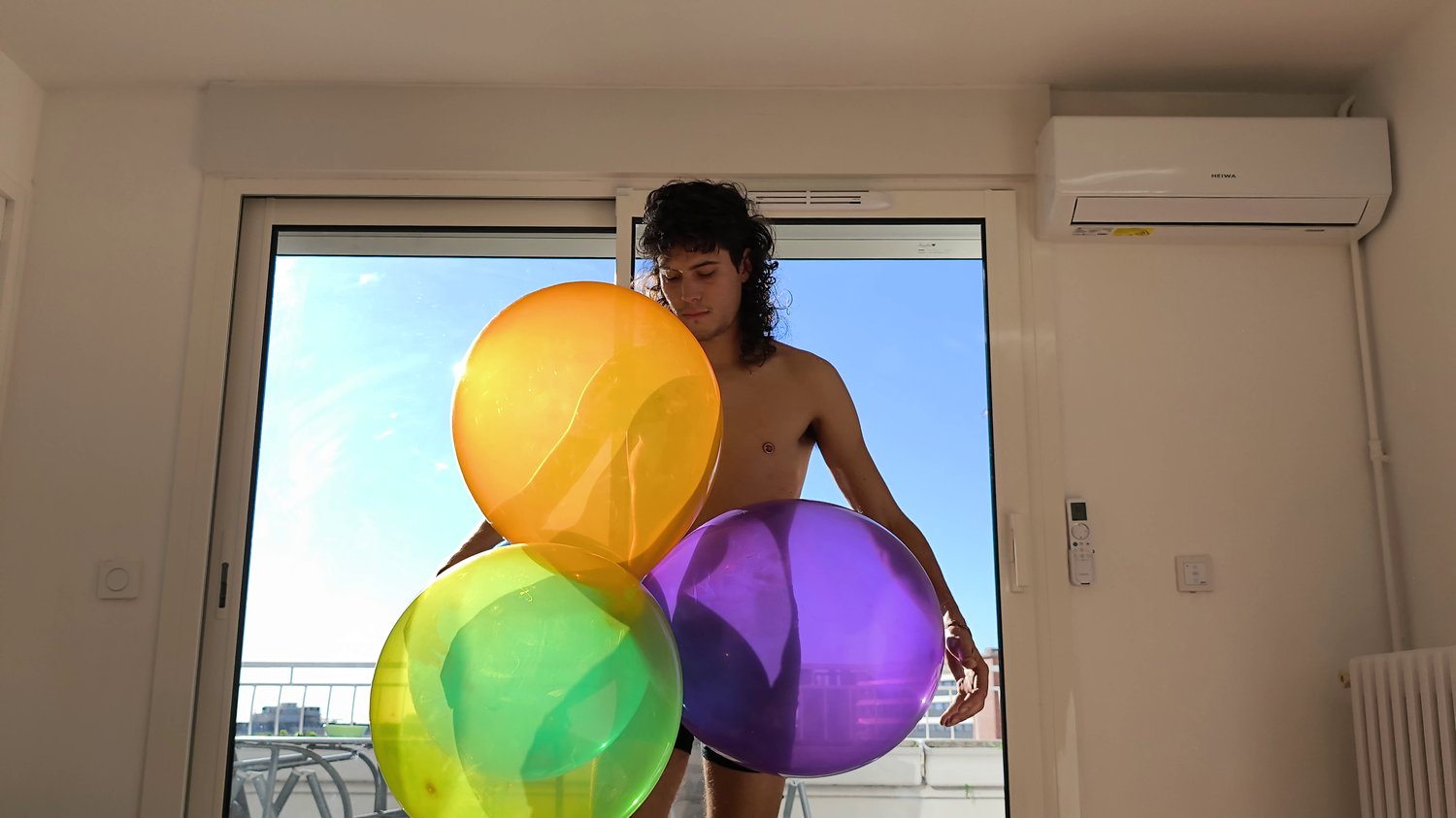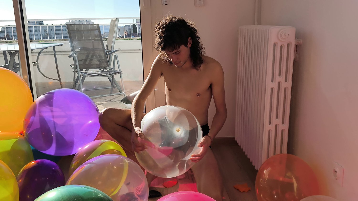 After that he lets it fly away and deflate, then puts it back in his boxer shorts.