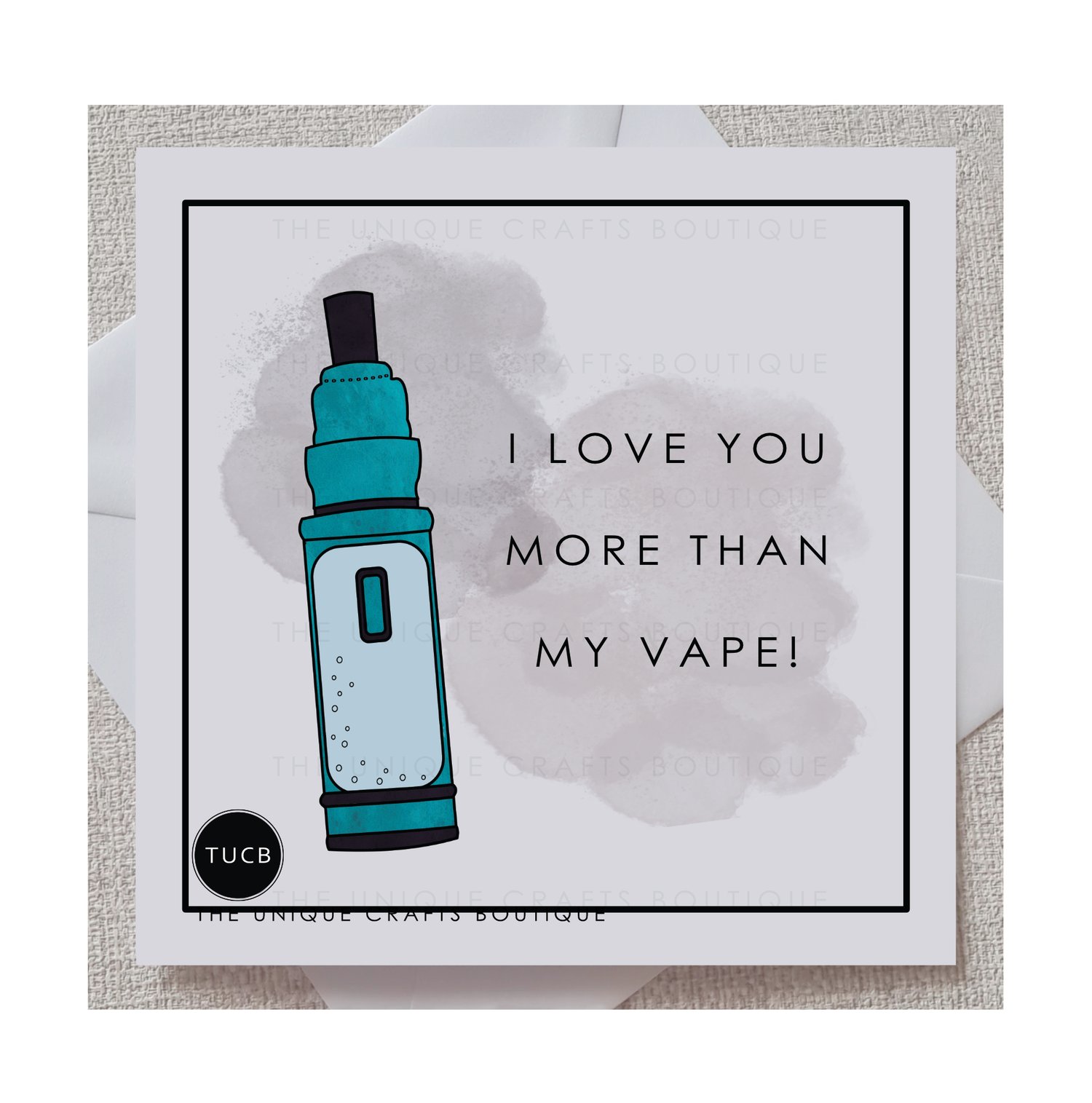 Printed with a hand-drawn vape and displaying the message 'I love you more than my vape'. This card is a certain to make your loved one smile.