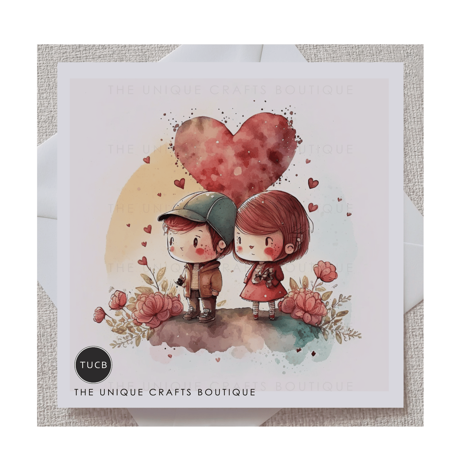 This card is perfect to show your love and make your partner smile this Valentine's Day. Printed with a cute couple stood in a flowery meadow below a rainbow and heart splash background.