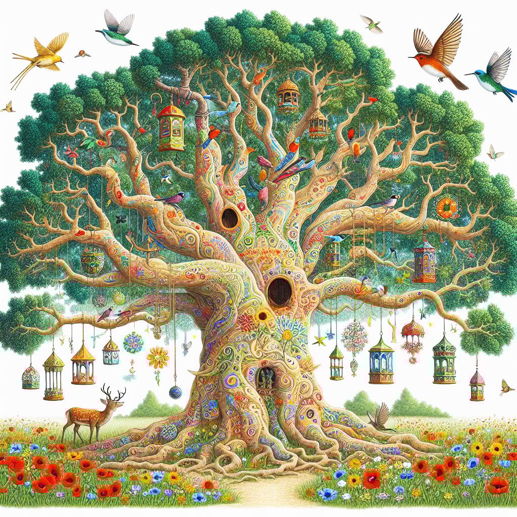 A big old oak tree, with elaborate colourful patterns throughout. It has deep roots & curly branches with green & blue leaves. It has beautiful glass bird houses & spinners hanging from its branches. There are colourful humming birds & robins. On the ground there are poppies & sunflowers & the tree is surrounded by a lake. There is a deer lying amongst the flowers.