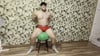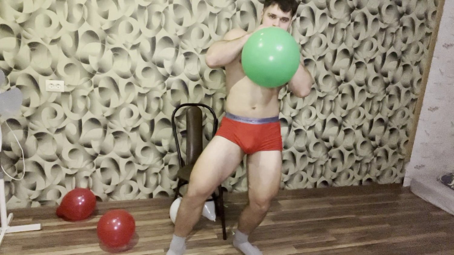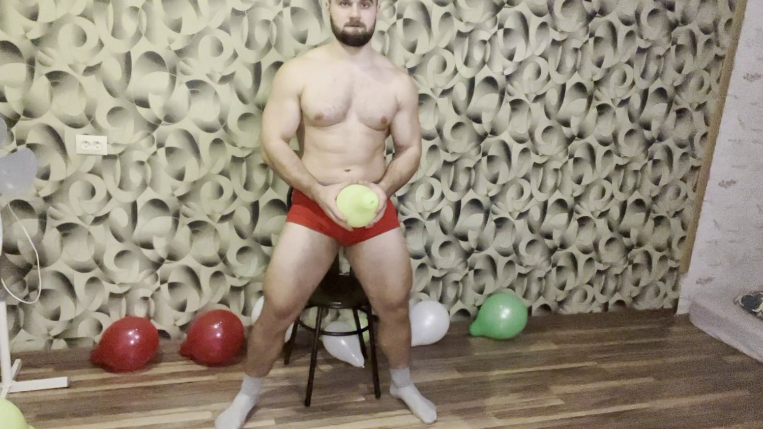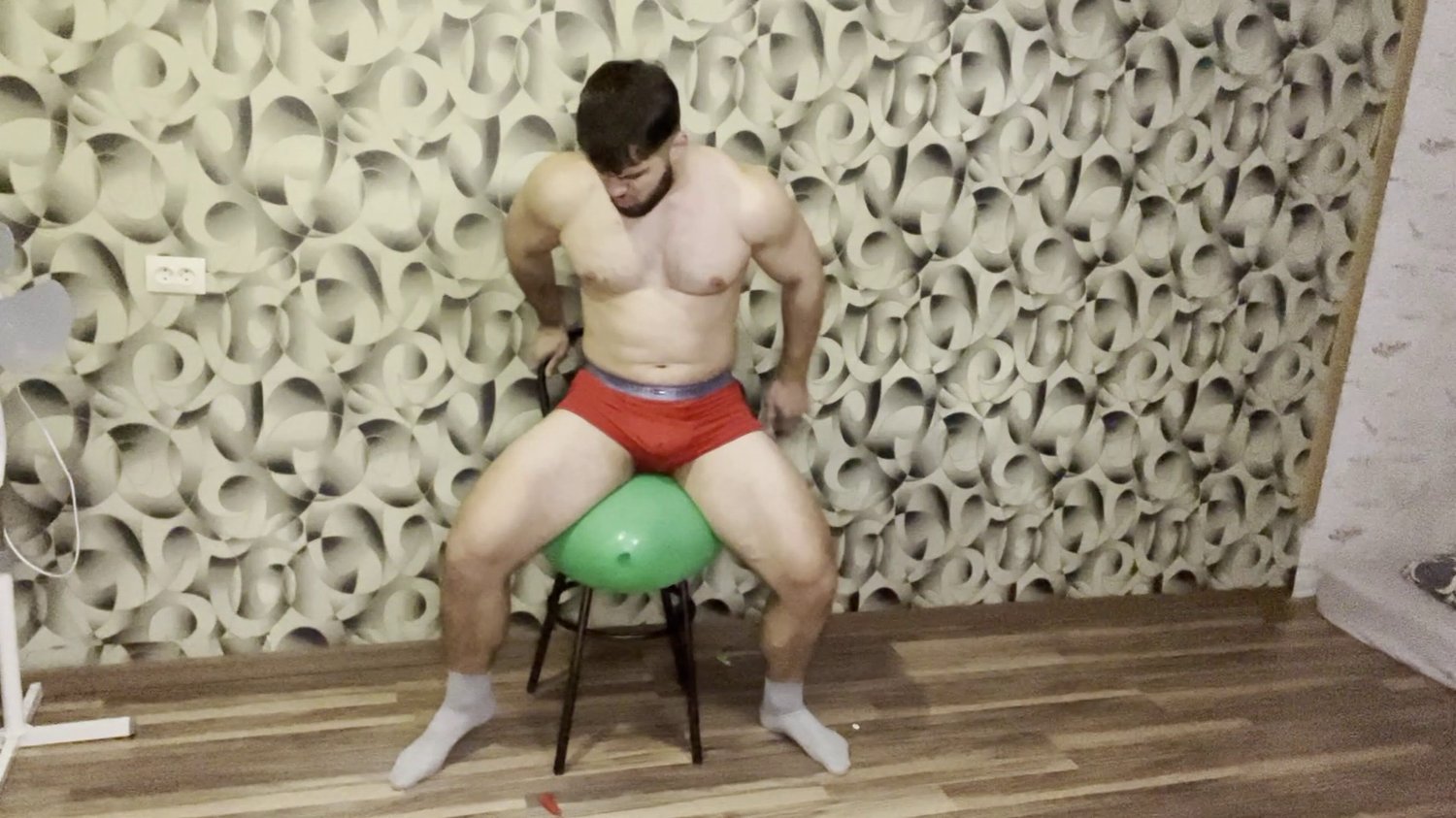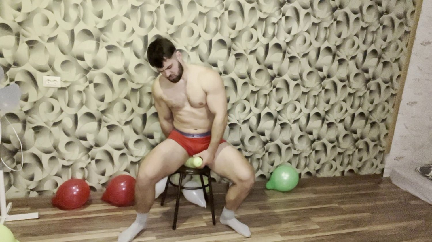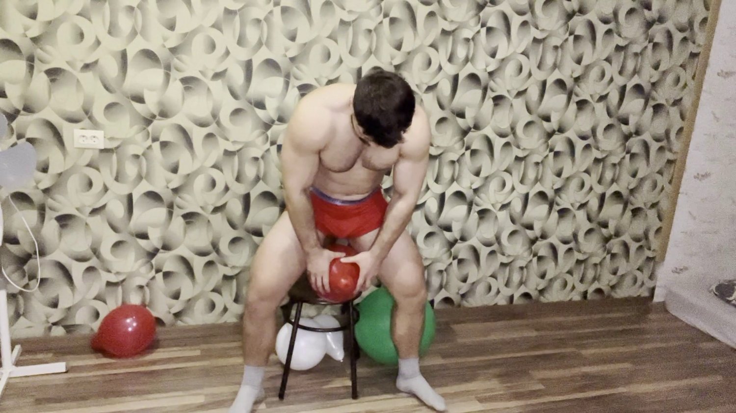 Muscular Guys Denis sits and pops some balloons on a chair!