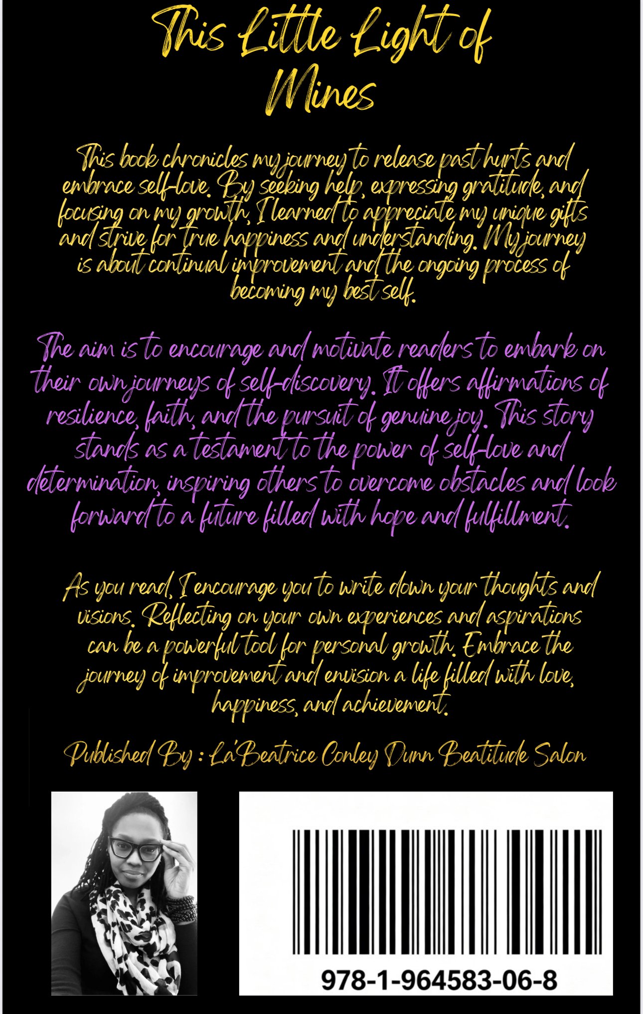 Your light is meant to shine—and this book will show you how. This Little Light of Mines is a heartfelt guide to embracing your unique gifts, letting go of doubt, and stepping boldly into the life God has for you. Through inspiring reflections and gentle encouragement, Dr. Dunn reminds you that no matter your struggles, your light can shine bright and touch the world around you.
