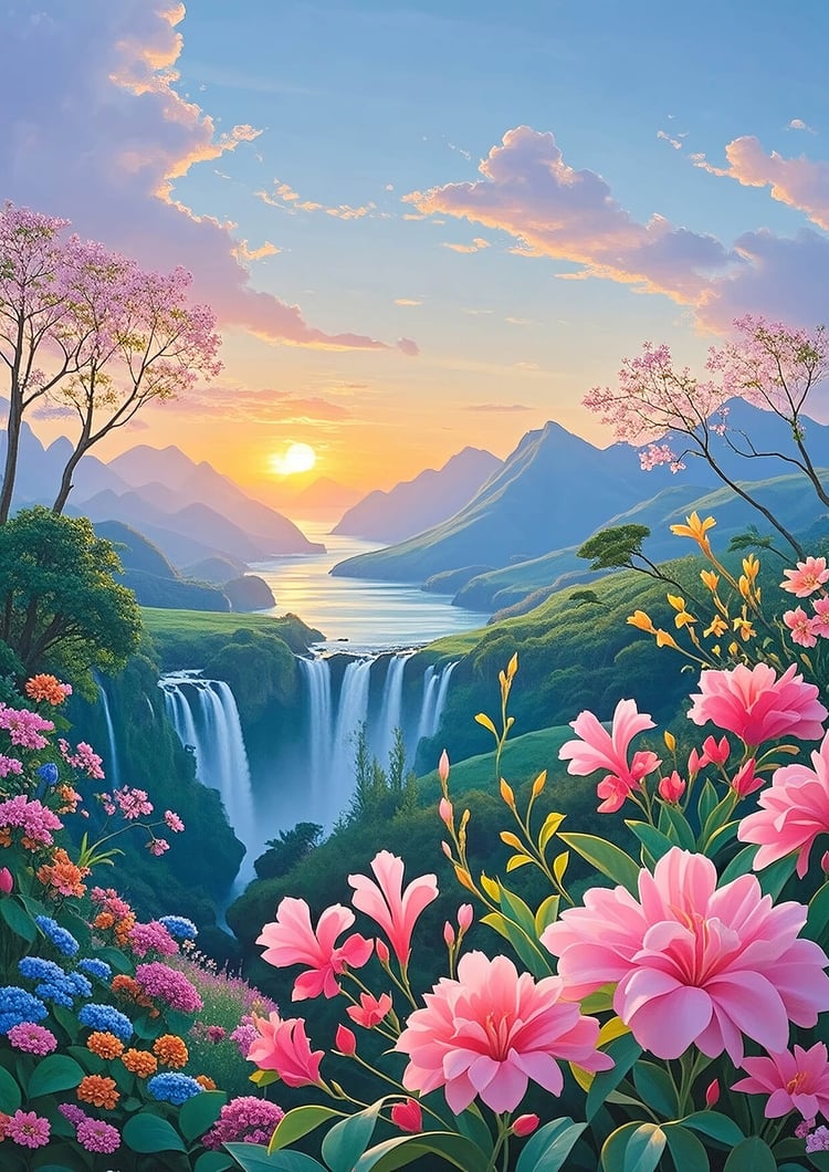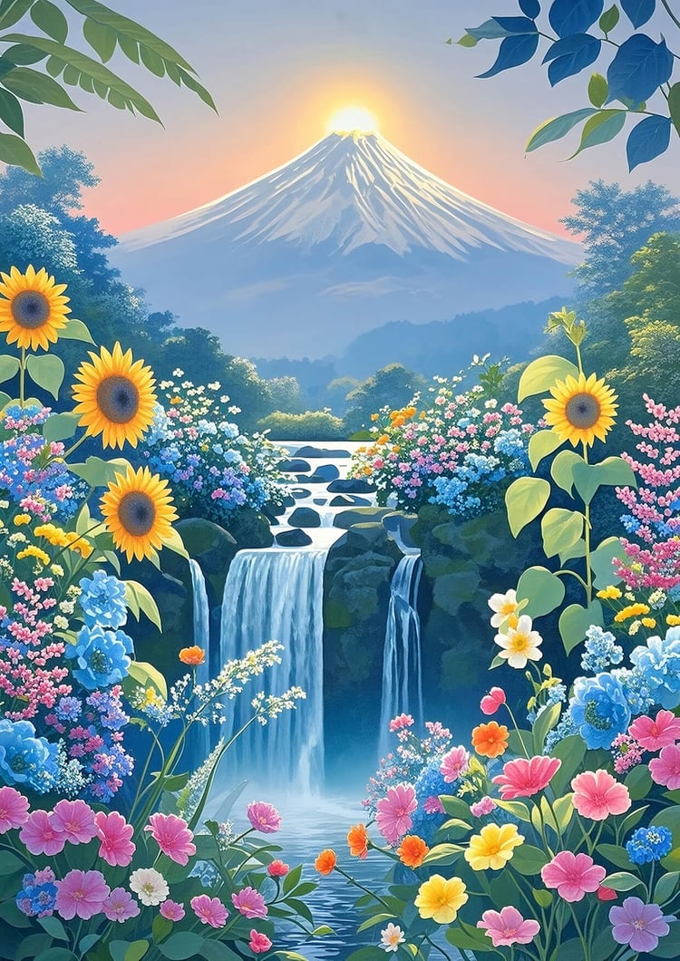 This stunning digital artwork features majestic Mt. Fuji bathed in sunrise light, flowing multi-level waterfalls, and vibrant blooming flowers—symbols of powerful energy, renewal, and upward momentum in Feng Shui.