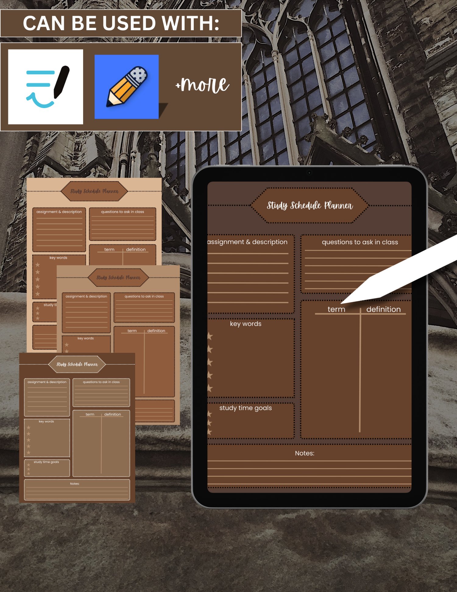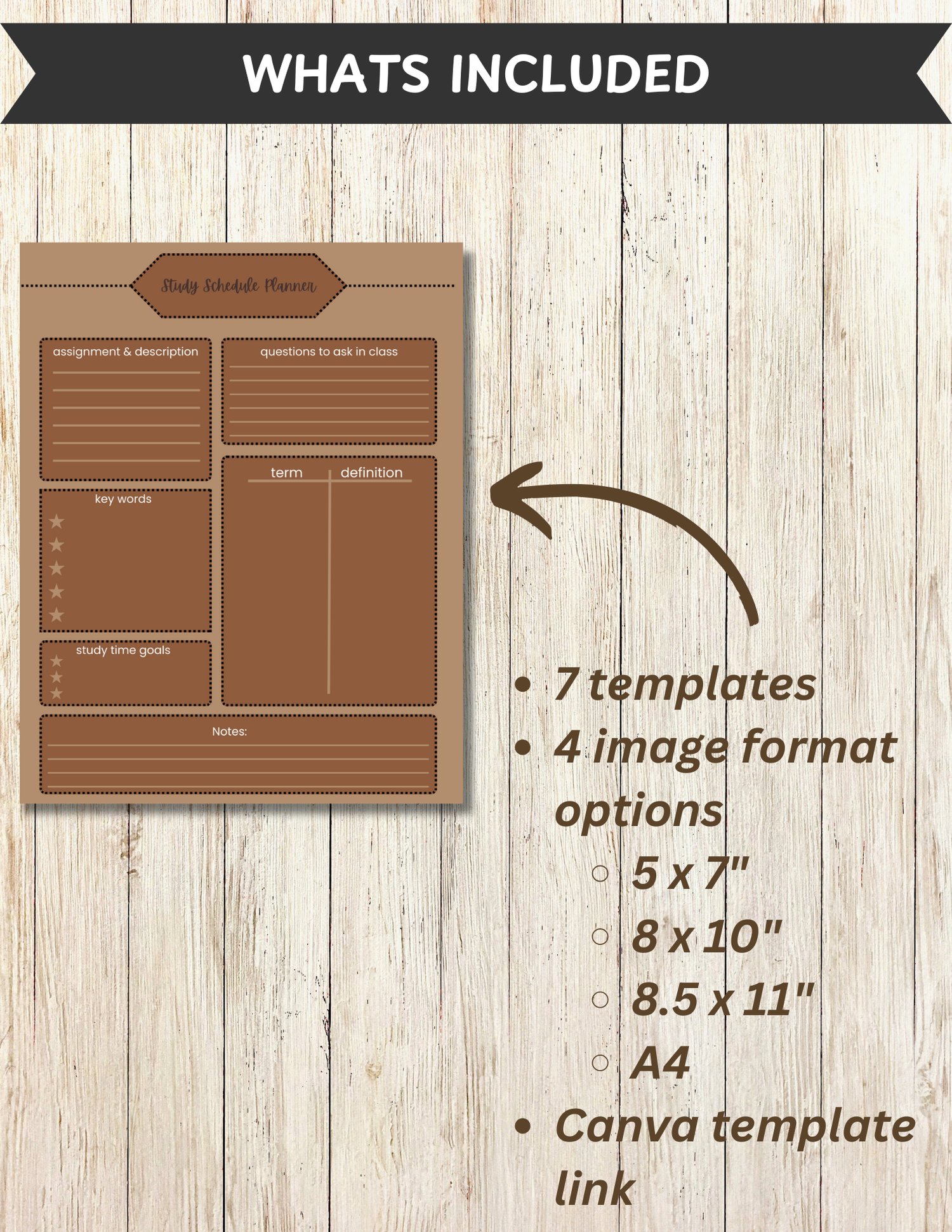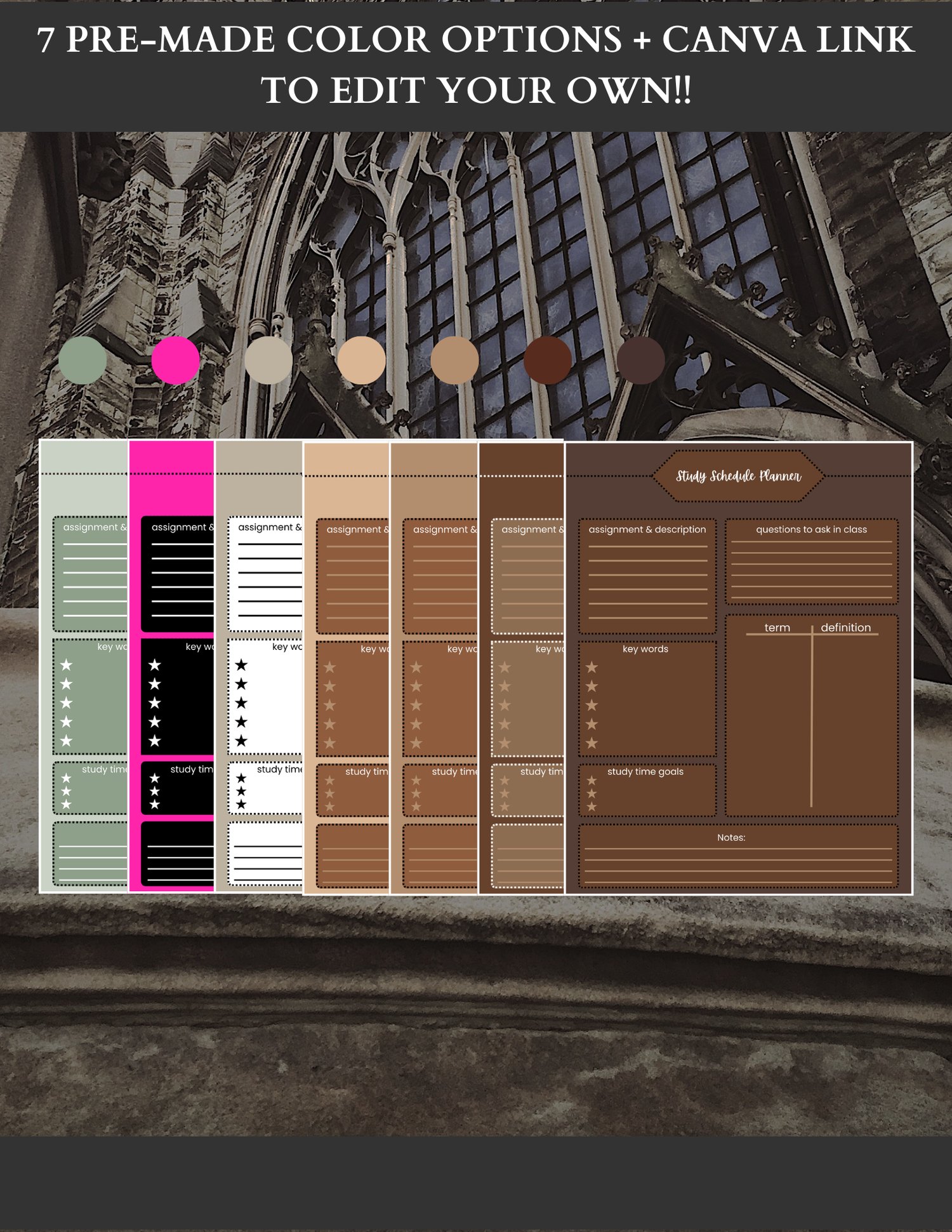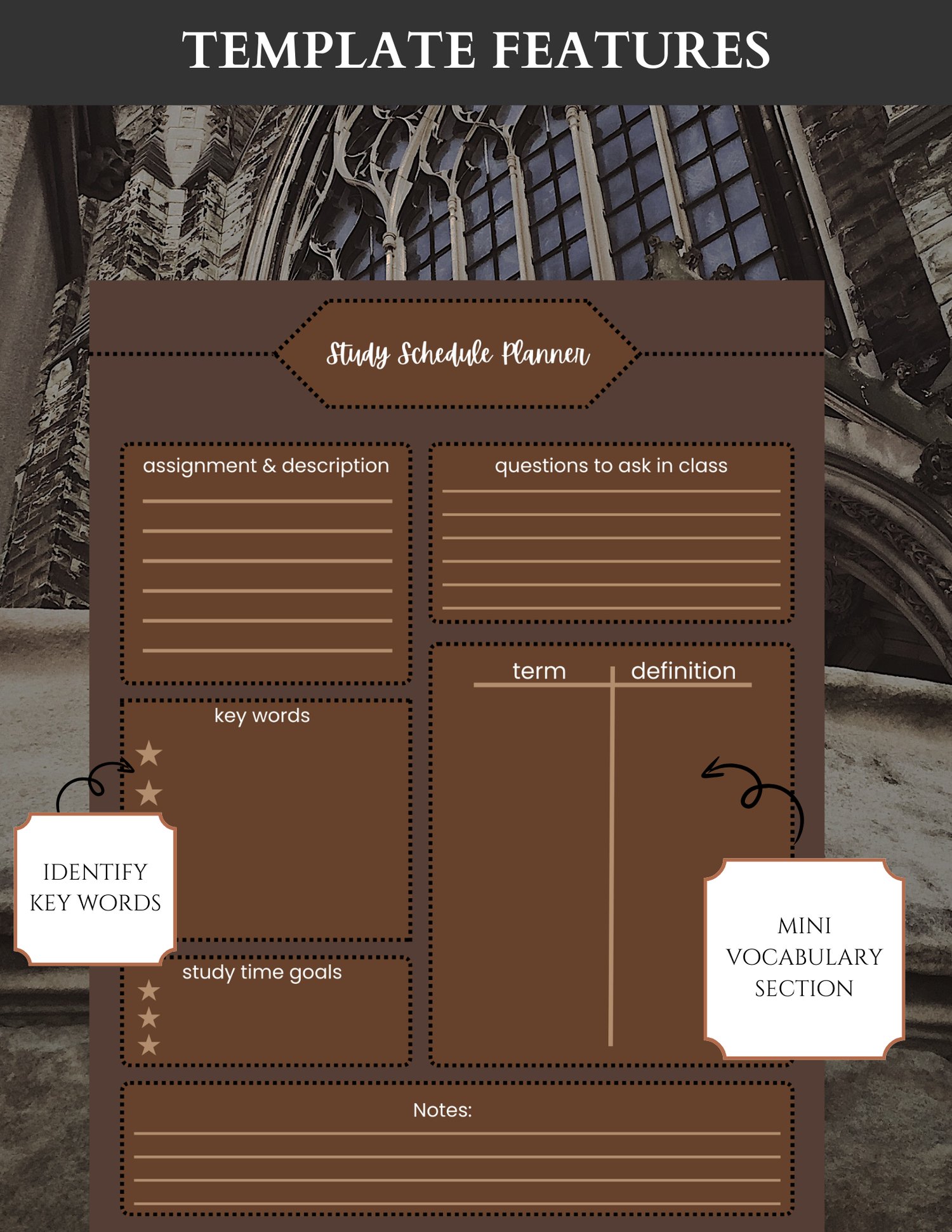 Manage your study time with this study schedule template. With detailed divided sections, you can plan out what you plan to accomplish in your study time without being overwhelmed. The secret to success is time management and with this template, you'll be sure to be successful in your classes. Don't wait, START NOW!