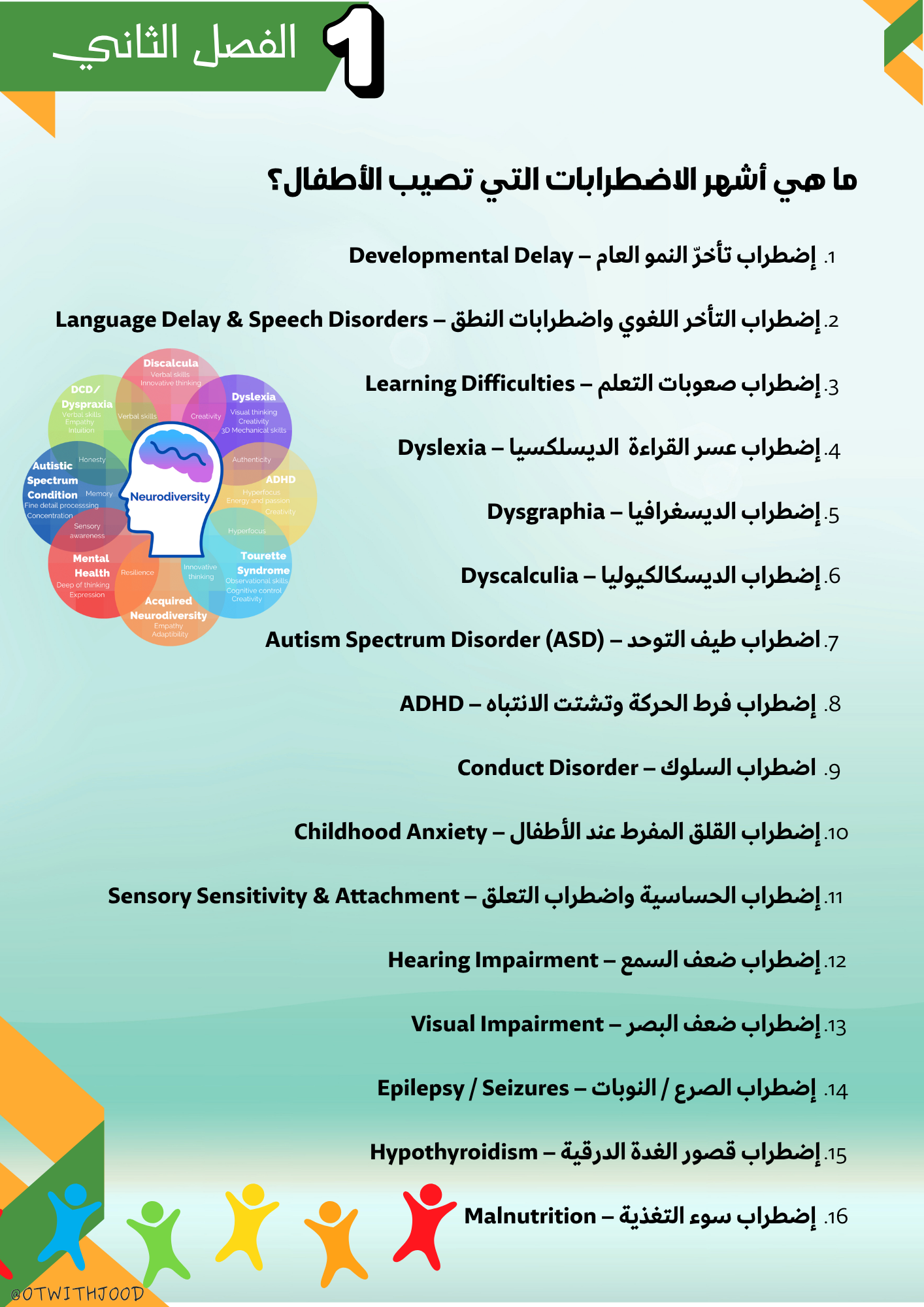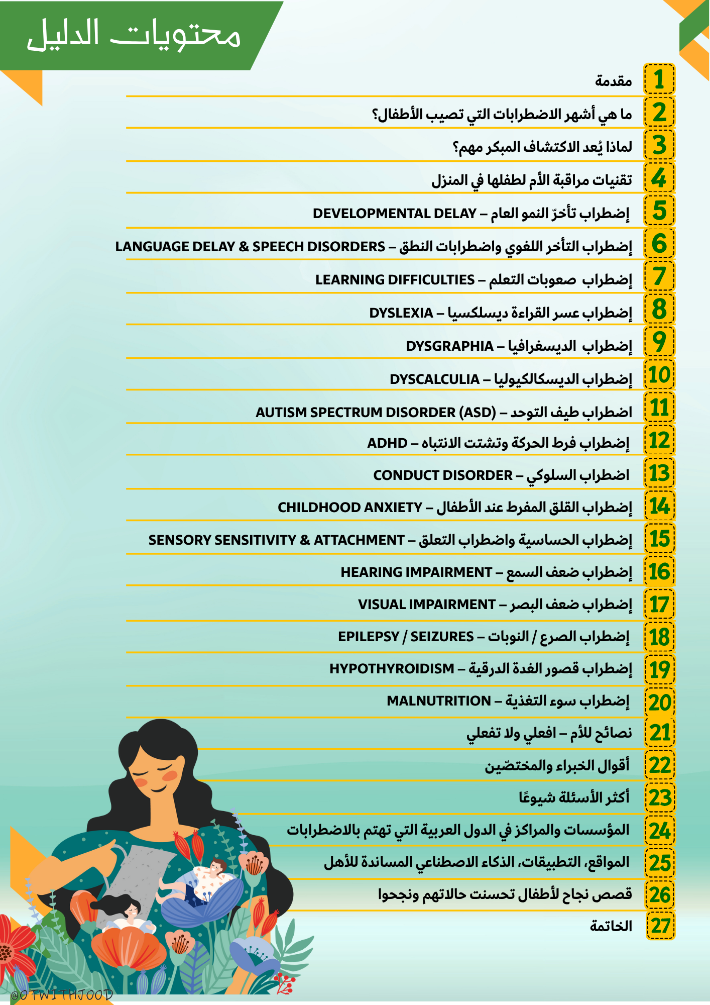 يضم الكتاب شرحًا مبسطًا ومفصلًا لأكثر من 16 اضطرابًا شائعًا تصيب الأطفال في السنوات الأولى، مع توضيح العلامات المبكرة، وطرق الملاحظة المنزلية، وأساليب التقييم التي يمكن للأم القيام بها بنفسه