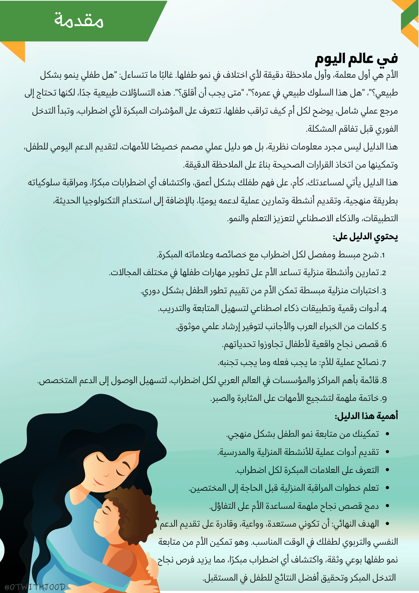 كما يتضمن الدليل قسمًا خاصًا بأقوال الخبراء، ونصائح عملية للأمهات، وأجوبة لأكثر الأسئلة شيوعًا، ليكون مرجعًا موثوقًا يساعدك على فهم طفلك من الداخل ويمنحك الأدوات الصحيحة لدعمه