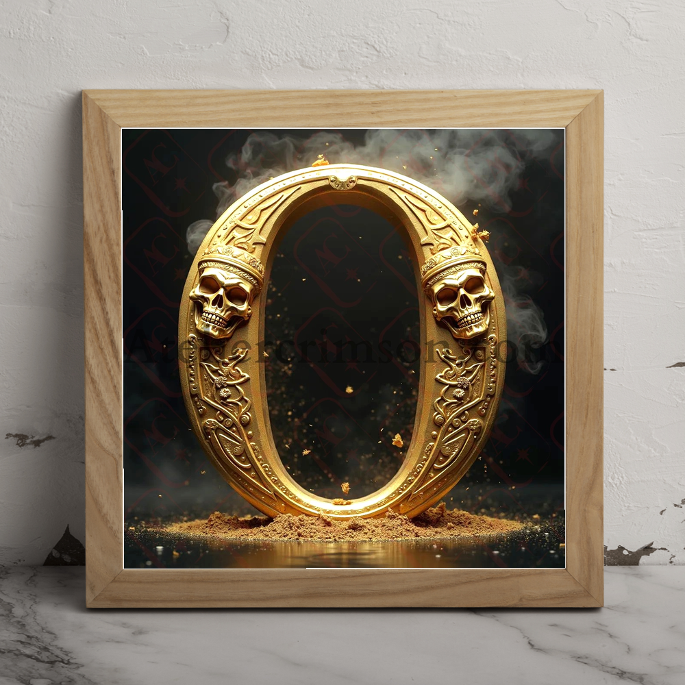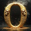 The letter O gold maya skull Skull-inspired engravings, hyper-realistic rendering. Mystical atmosphere with subtle smoke effects. Perfect for high-end typography and design projects. GoldTypography LuxuryDesign SkullArt"