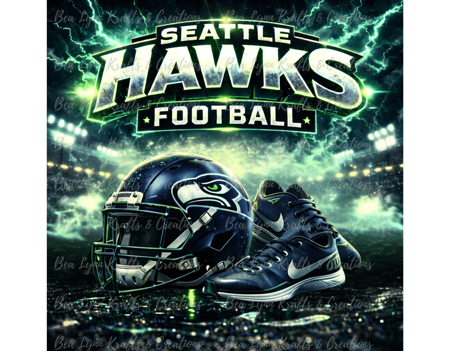 Bring powerful game-day energy to your projects with this Seattle Hawks football-themed PNG design. This bold artwork features a dramatic stadium scene with neon green lightning, glowing stadium lights, a detailed football helmet, and athletic sneakers inspired by Seattle football culture.