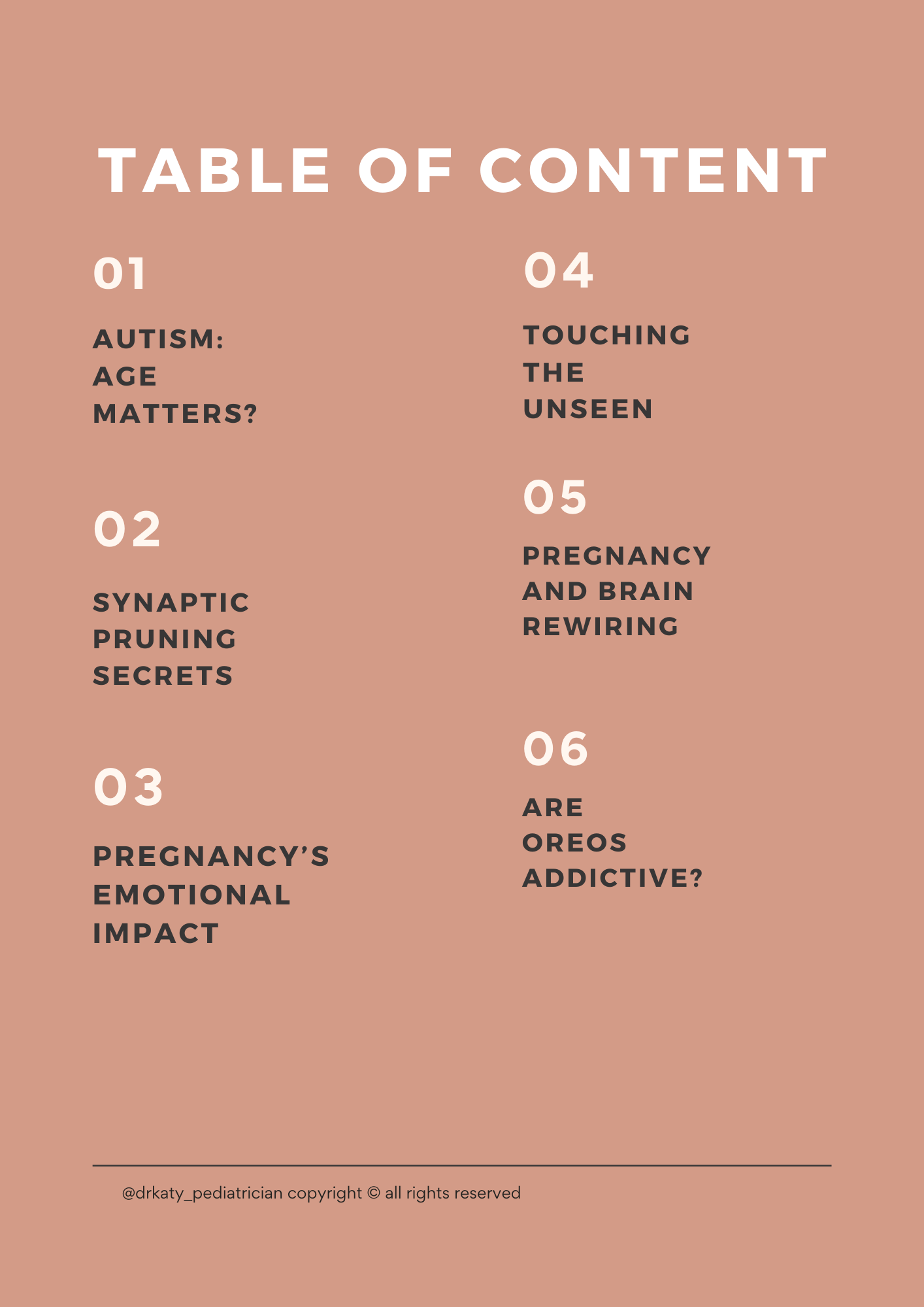 Introducing KIDDOS Magazine, your ultimate guide to child health and parenting! This issue is packed with insightful articles that cater to the modern parent, ensuring you stay informed and empowered.Autism: Age Matters? delves into the critical developmental stages and how they impact autism diagnosis and treatment. Understanding this can help parents navigate their child's unique journey more effectively.Next, Synaptic Pruning Secrets reveals the fascinating science behind brain development in children. This essential process shapes how your child learns and interacts with the world, making it a must-read for every parent.The emotional landscape of pregnancy is explored in Pregnancy’s Emotional Impact. This article offers a heartfelt look at how expectant mothers can manage their mental health during this transformative time, emphasizing the importance of emotional well-being for both mother and child.In Touching the Unseen, we explore the invisible connections that bind families together. This piece highlights the significance of emotional intelligence in nurturing healthy relationships within families.Curious if Oreos Are Addictive? This light-hearted yet informative article examines the science behind cravings and how certain foods can affect our behavior, making it a fun read for parents and kids alike.Lastly, Pregnancy and Brain Rewiring discusses how pregnancy alters a mother's brain, enhancing her ability to bond with her newborn. This intriguing exploration is essential for understanding maternal instincts and behaviors.KIDDOS Magazine was born from a passion for fostering strong family connections through knowledge. Our mission is to provide valuable content that resonates with parents navigating the complexities of raising children in today’s world. With expert insights and relatable stories, we aim to empower you on your parenting journey.Join our community of informed parents today! Don’t miss out on this enriching experience—grab your copy now! #KiddosMagazine #ChildHealth #ParentingTips #AutismAwareness #BrainDevelopment #PregnancyJourney #FamilyBonding #HealthyKids #ParentingCommunity #KnowledgeIsPower