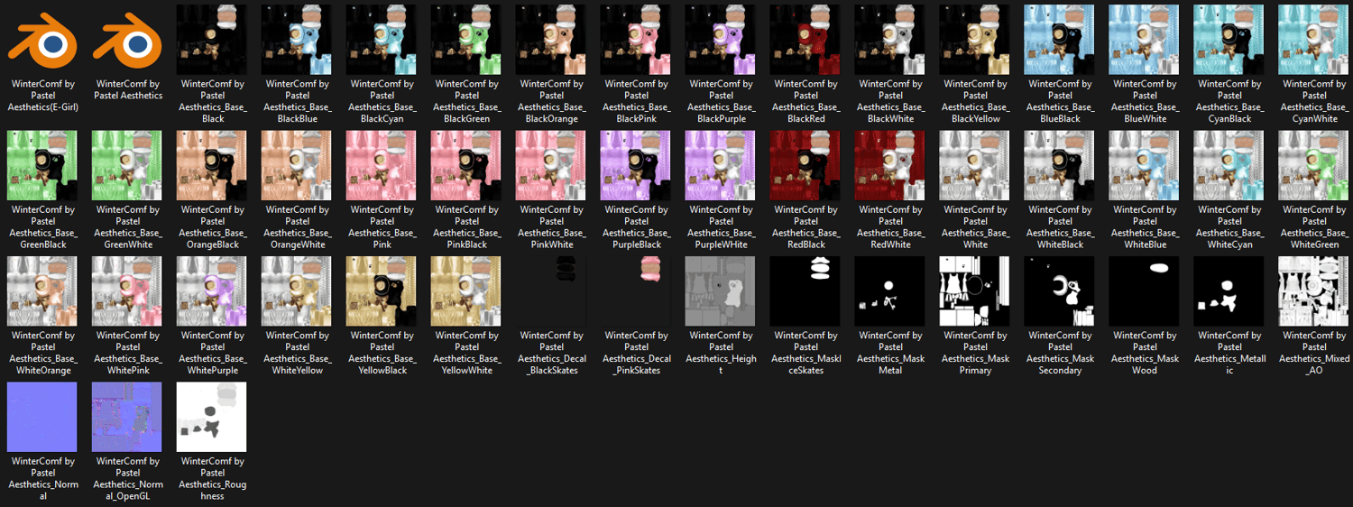 49 Textures (36 Base Colours, Height, Metallic, MixedAO, Normals, Roughness, Decals, Masks)