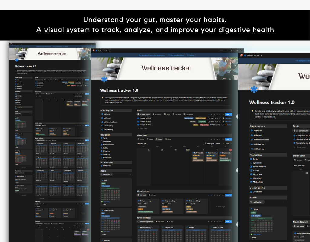 Take control of your digestive health with the all-in-one Wellness Tracker Notion template. This comprehensive hub helps you uncover the connection between your daily habits, lifestyle choices, and gastrointestinal well-being — giving you data-driven insights to improve your gut health naturally.