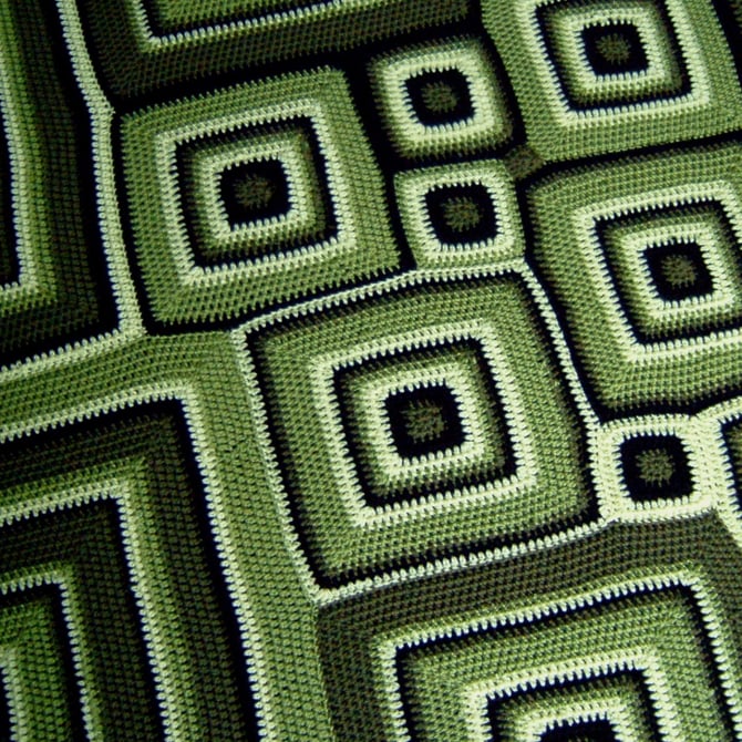 The maths was indeed challenging. The numbers needed to make squares of the correct sizes are in conflict with the numbers usually needed to make squares that will lie flat and fit together. We could not find any other kind of square that would work exactly without making an afghan that was much too big for practical use.