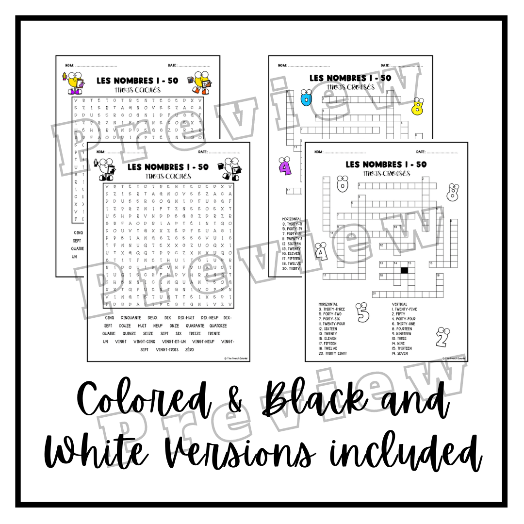 FRENCH Numbers 1-50 / Les Nombres 1-50 Word Search & Crossword Activities