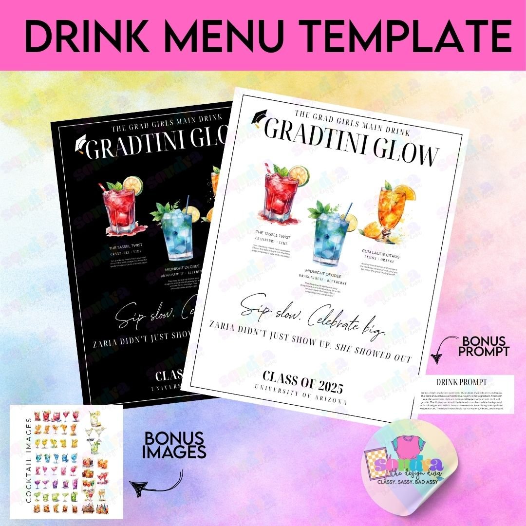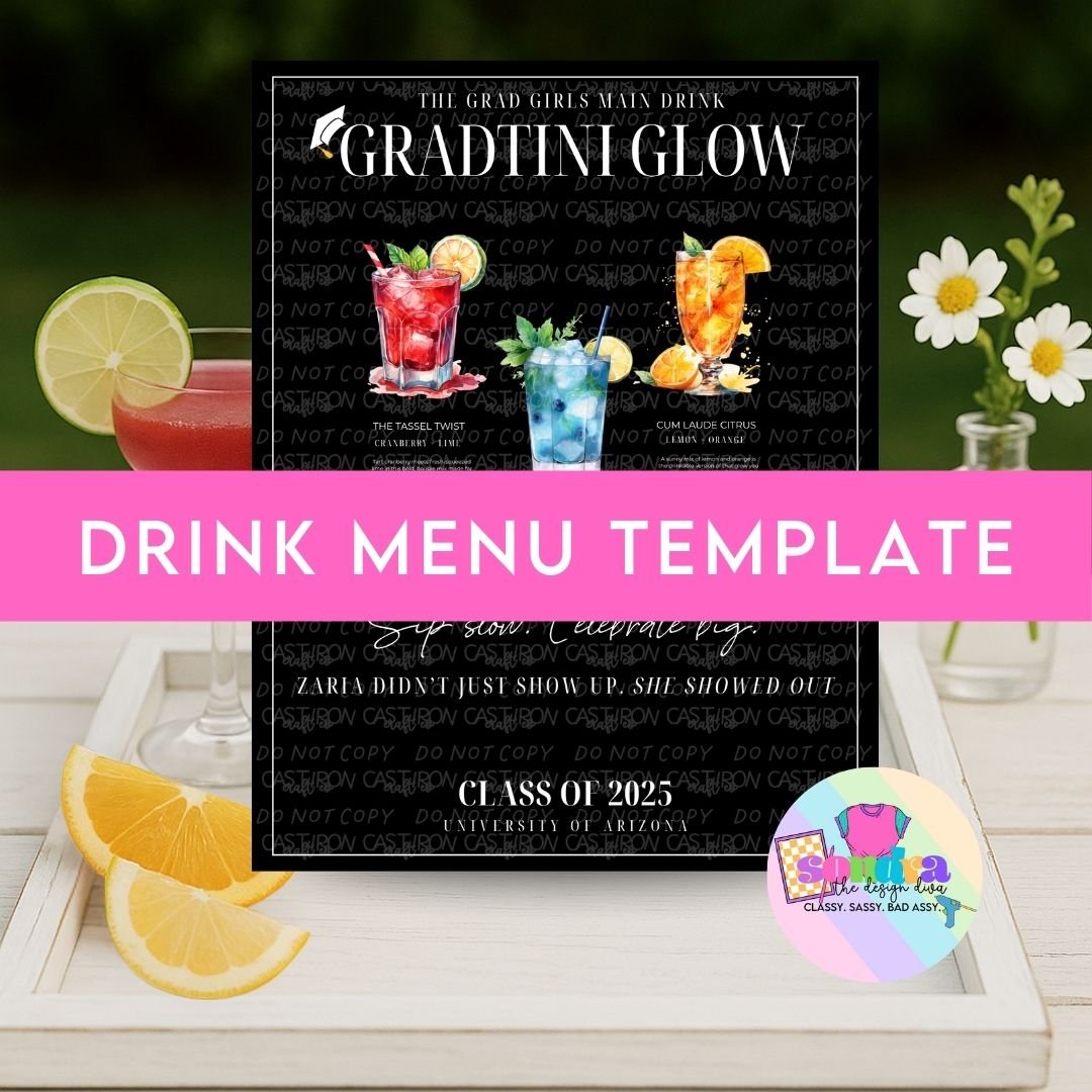 Celebrate in style with this elegant and fun Editable Graduation Drink Menu Template – perfect for adding a personalized touch to your Class of 2025 party bar setup. This digital product is ideal for graduation celebrations and can be customized to match your school colors or signature drinks.