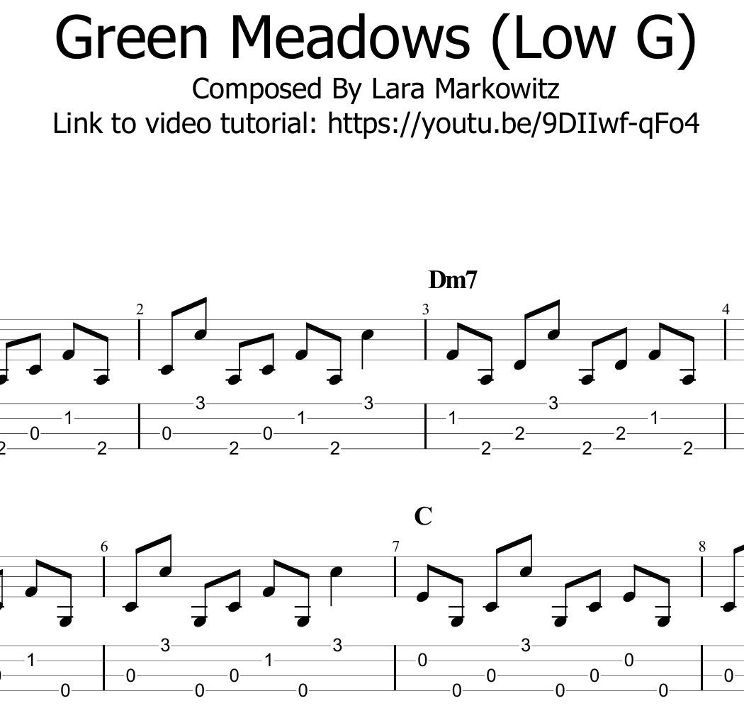 Download the ukulele tabs for my original fingerstyle melody called Green Meadows. This download includes both the Low G and High G arrangements.