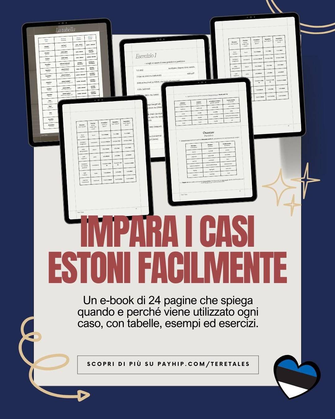 24 pagine dedicate solo per imparare i casi grammaticali estoni! Se hai già cominciato a studiare l'estone un po' ,allora lo sai che i casi sono la parte più difficile e noiosa da capire. Per questo ho creato un pdf con tabelle, spiegazioni ed esercizi per rendere più facile questo processo. Impara facilmente i casi grammaticali estoni!