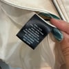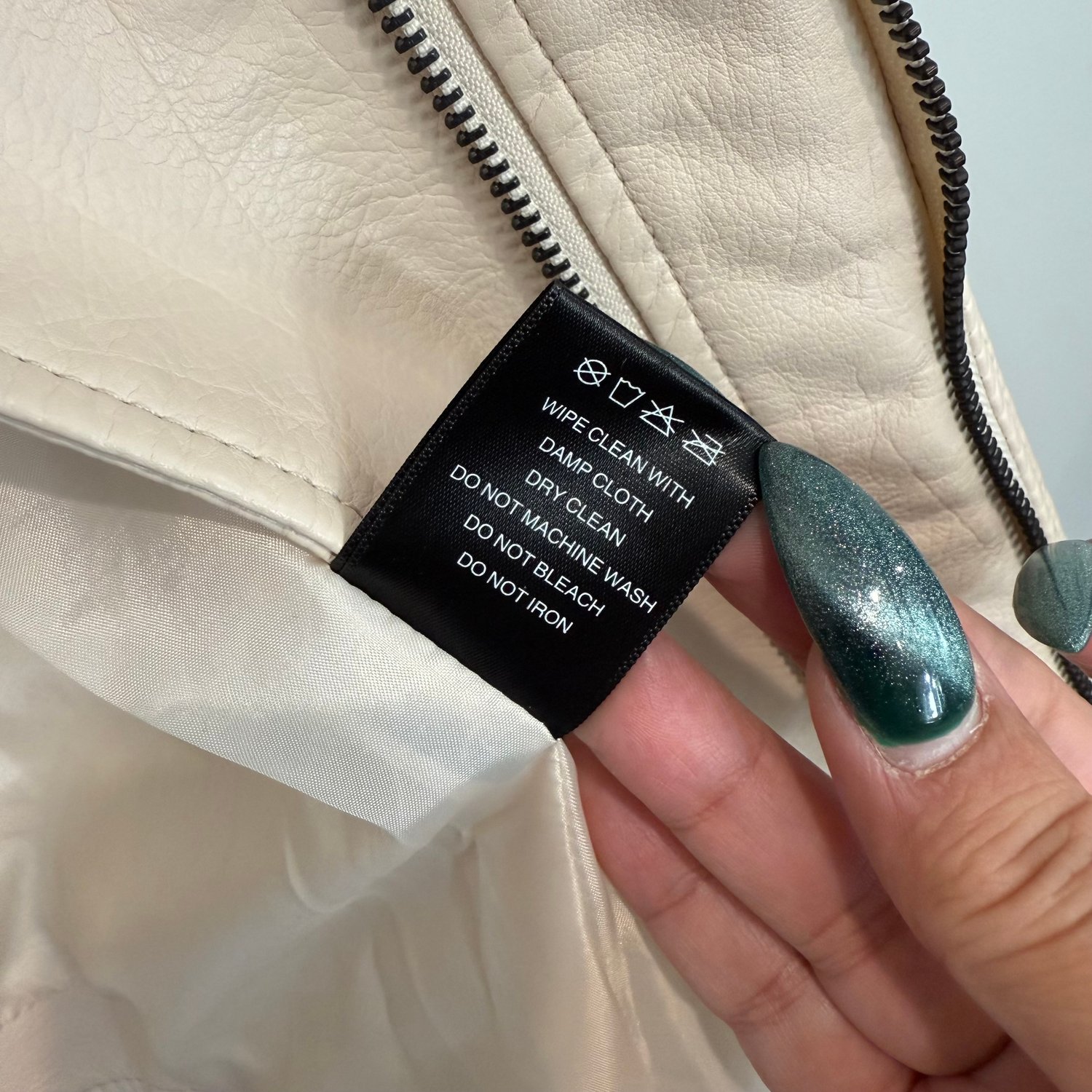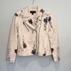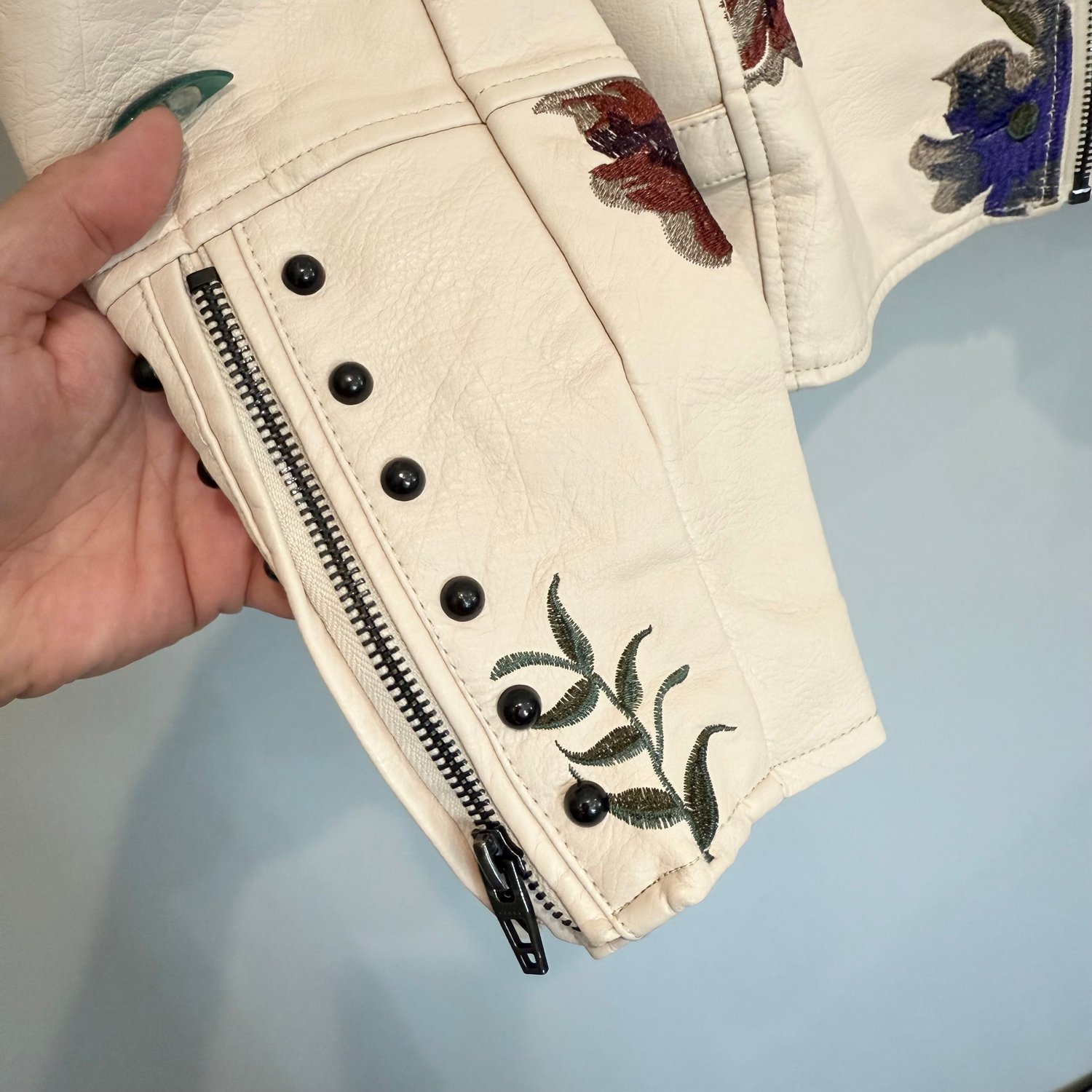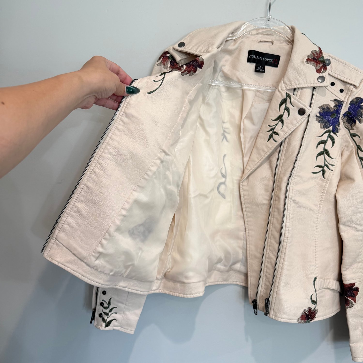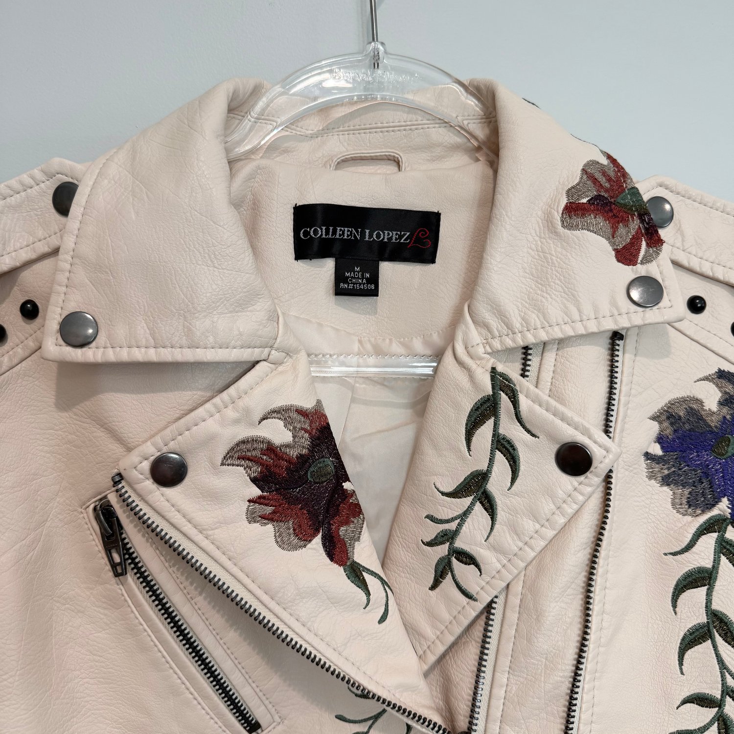 Colleen Lopez cream colored faux leather moto jacket with gunmetal hardware, black studs, dark colored floral embroidery, zippers at the cuffs and an A-symmetrical zipper. (the inner one is the only one I can get to work).