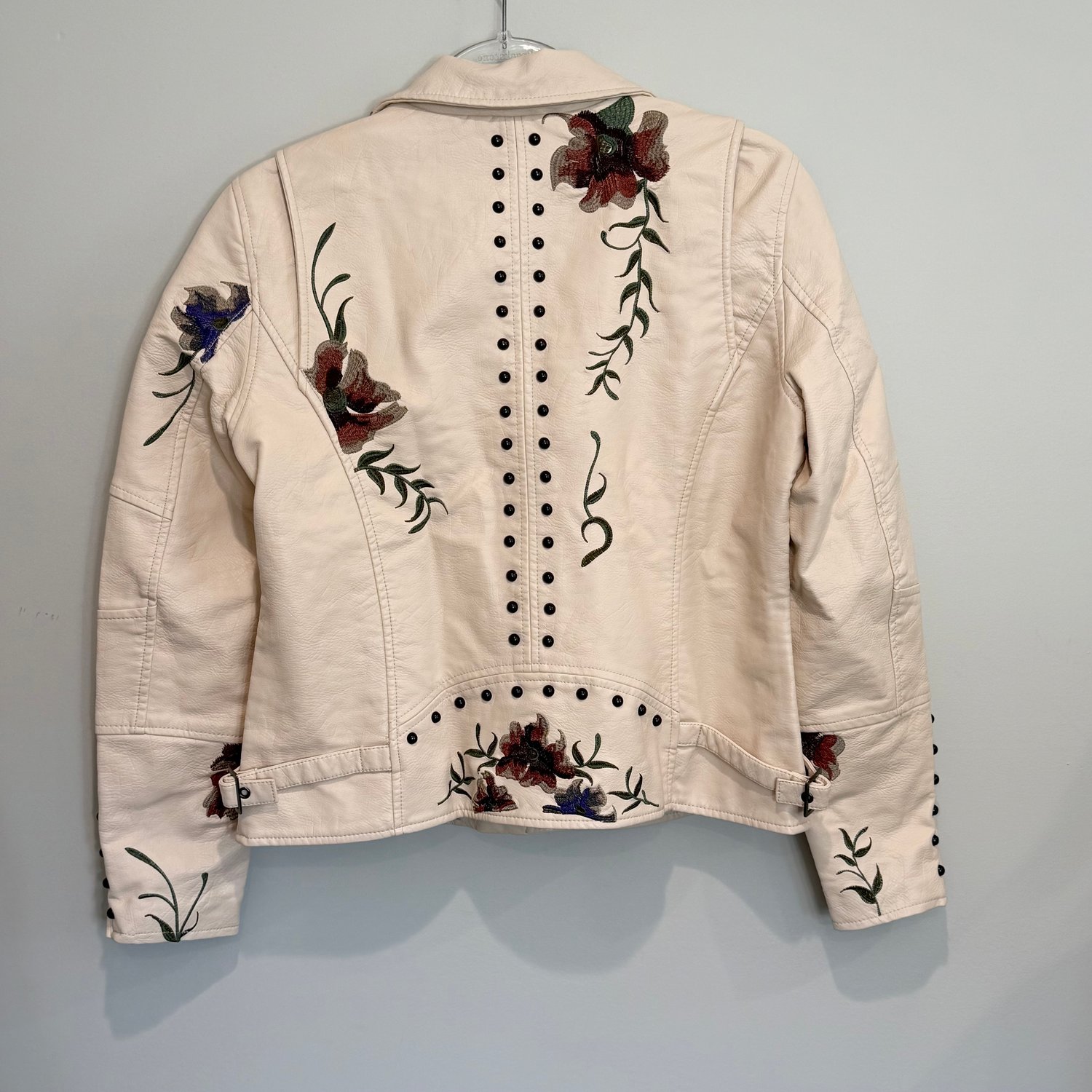 Colleen Lopez cream faux leather studded and floral embroidered moto jacket - size Medium