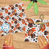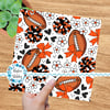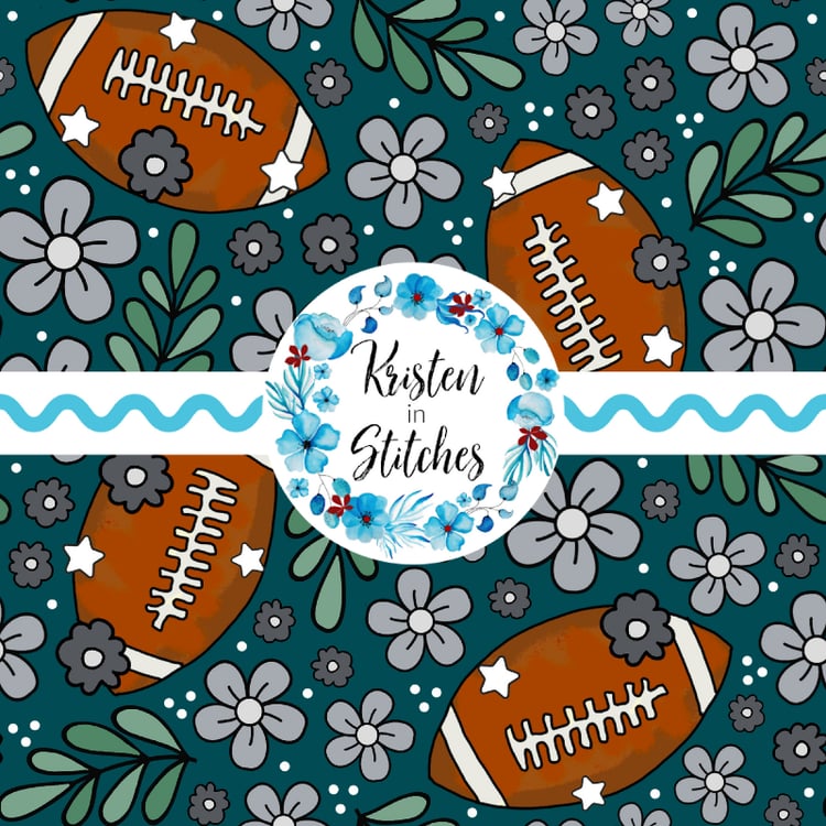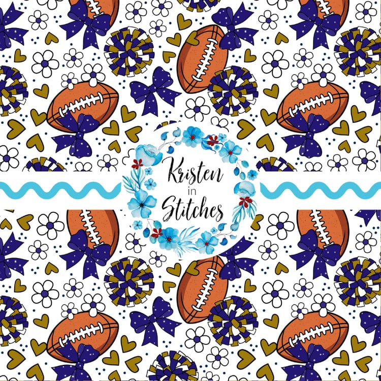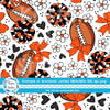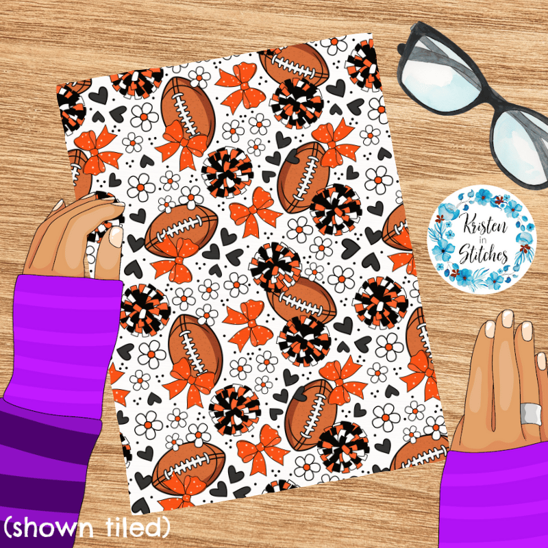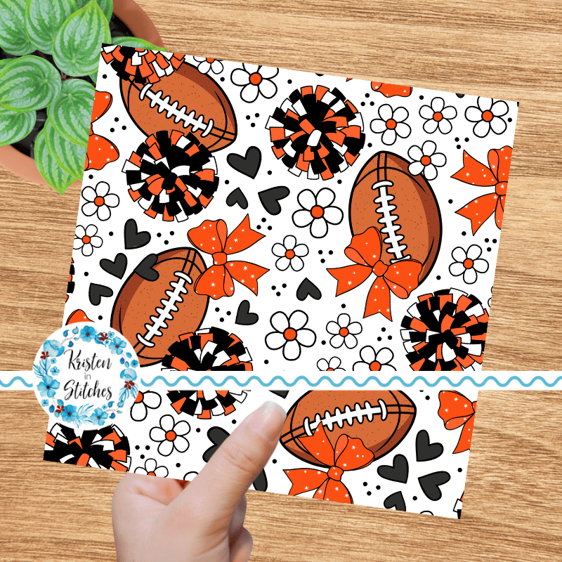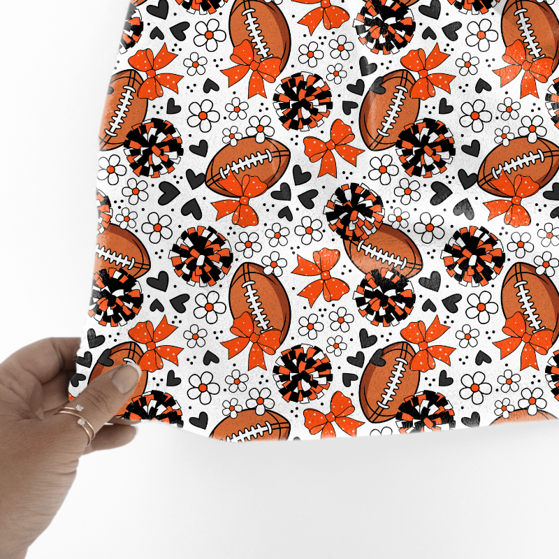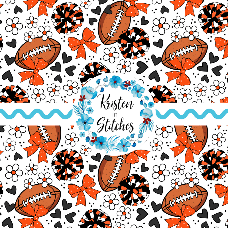 Floral pattern with daisy flowers, cheerleader bows, pompoms, footballs and hearts in Cincinnati Bengals colors, orange and black.