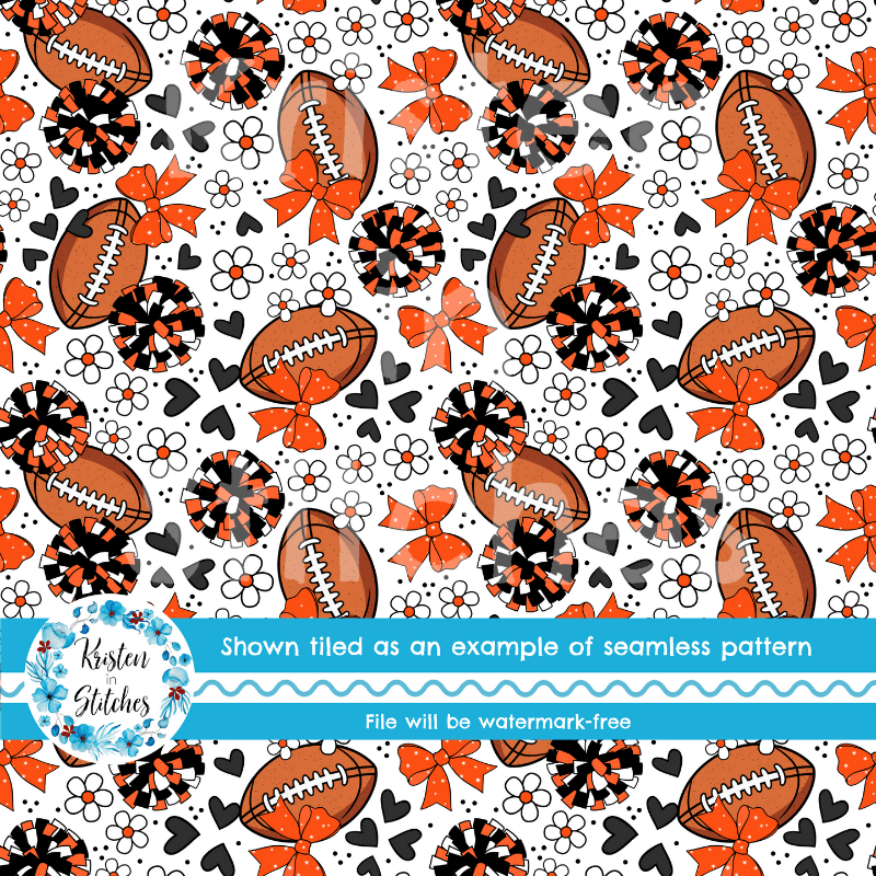 Football Cheer Bows and Pom Poms Seamless Pattern, Cincinnati Bengals Colors Orange and Black