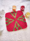 The square measures 10" and made with JoAnn's Big Twist Value yarns and 5 mm hook.