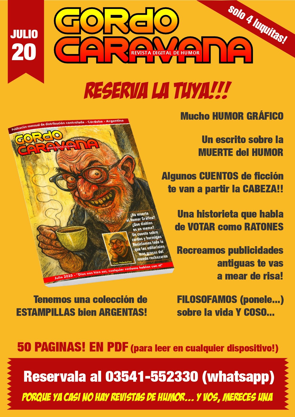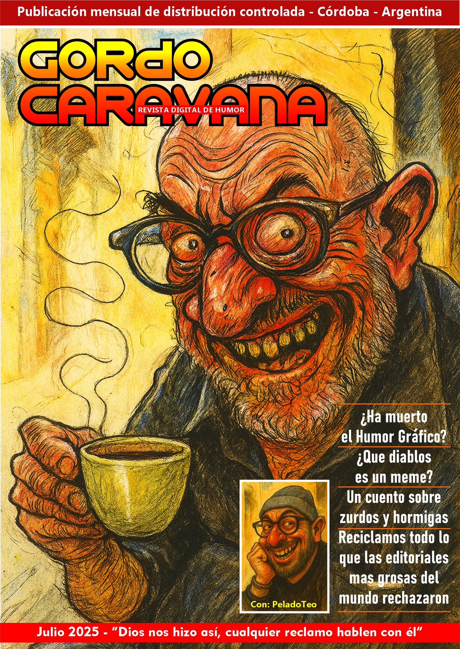La revista mensual Gordo Caravana es un producto del humorista Gustavo Gal, argentino y cordobés. El número en cuestión tiene 50 páginas llenas de humor gráfico, cuentos de ficción, reflexiones, cartelería y bromas varias. No tenemos publicidad para que usted tenga 100% de contenido, por lo tanto, apelamos a su buena voluntad para sostener este IMPRESIONANTE (bueno...) refugio del humor.