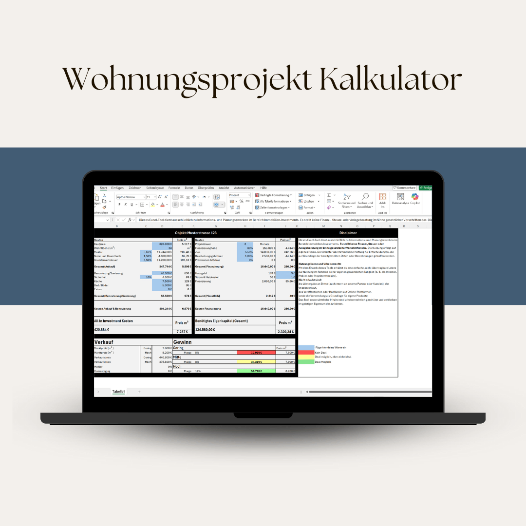 Berechne Fix-&-Flip-Deals sekundenschnell: Kauf, Sanierung, Finanzierung, Verkauf & Marge in einem Tool. Mit Szenarien, Eigenkapital-Berechnung, ROI-Analyse & Deal-Ampel. Ideal für Investoren & Projektentwickler. Sofort einsatzbereit.