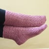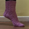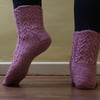 Quietest Moments Socks are knitted with a lace pattern on the leg and instep. The stretchy lace patterns produce a comfortably fitting sock. The instructions include information on how to adjust the heel flap to give a good fit at the heel and therefore adjust the gusset. This allows adaption for a high instep or to increased ease to prevent constriction.