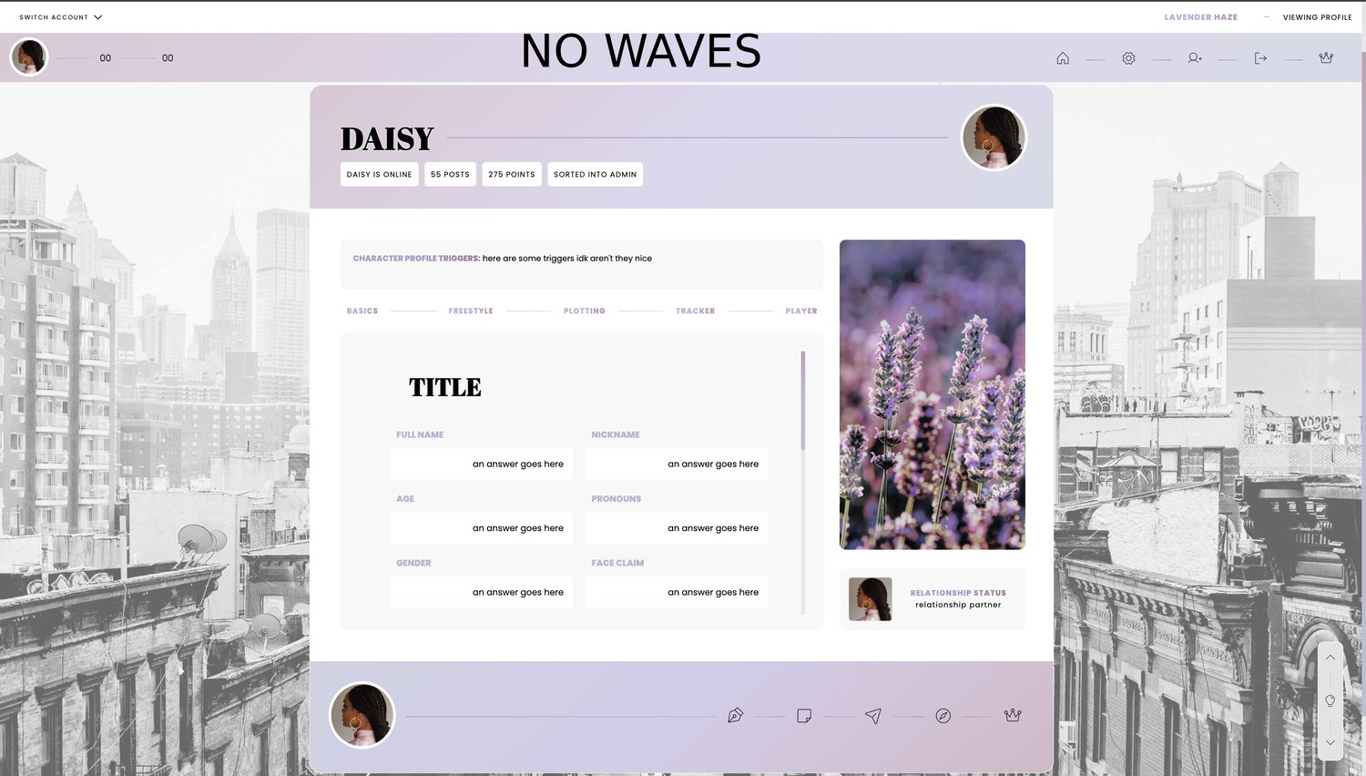 a colourful, wavy, easily editable and modern skin for jcink roleplay sites.