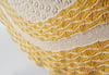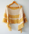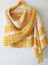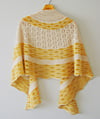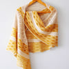 Sign of the Sun was inspired by Jessie Burton’s The Miniaturist, a novel of love, marriage, and betrayal in the 17th-century Amsterdam. This shawl is soft and romantic — but the design is modernized with the addition of a bright color and crisp textures.Sign of the Sun is worked from the top down as a hybrid between a semi-circle and a crescent. Interspersed with sections of stockinette and lace in the main color are sets of elongated stitches worked in a contrasting color.