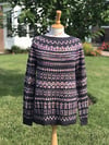 Graphica is a super fun top down, “graphic” pullover that is a collaboration with Dragonfly Fibers for Vogue Knitting Live this weekend. It starts with some fun loop-de-loops and transitions into some graphic botanicals. Each sleeve size then displays slightly different color work (and you can borrow from other sizes if you like). You will be amazed how quick this is to knit!