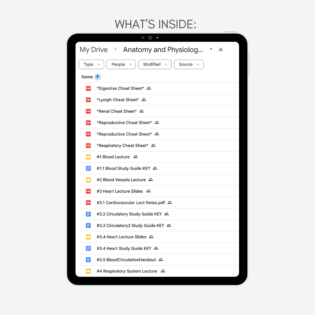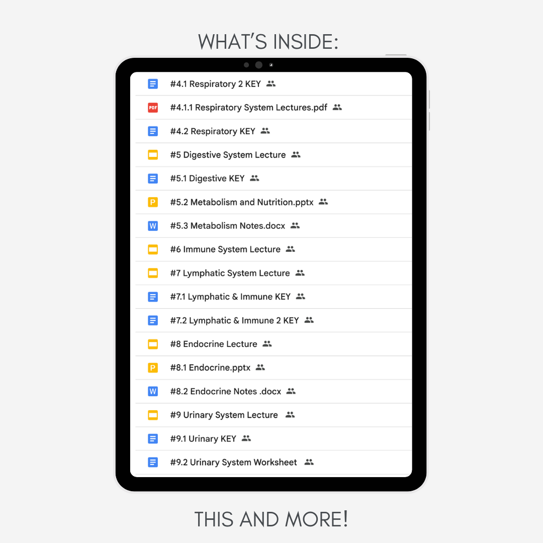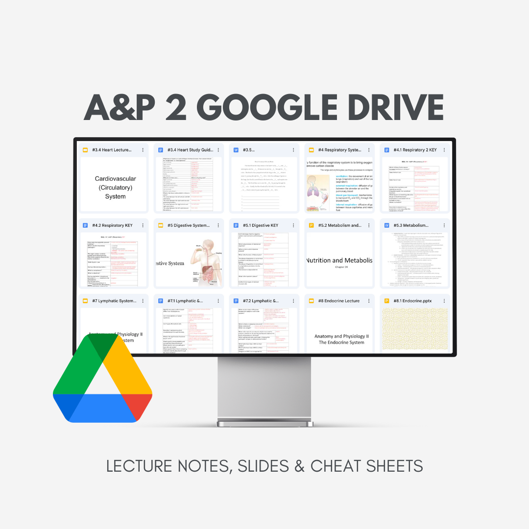 My Google Drive includes a full collection of lectures, study notes, worksheets, and cheat sheets to help you succeed in Anatomy & Physiology II