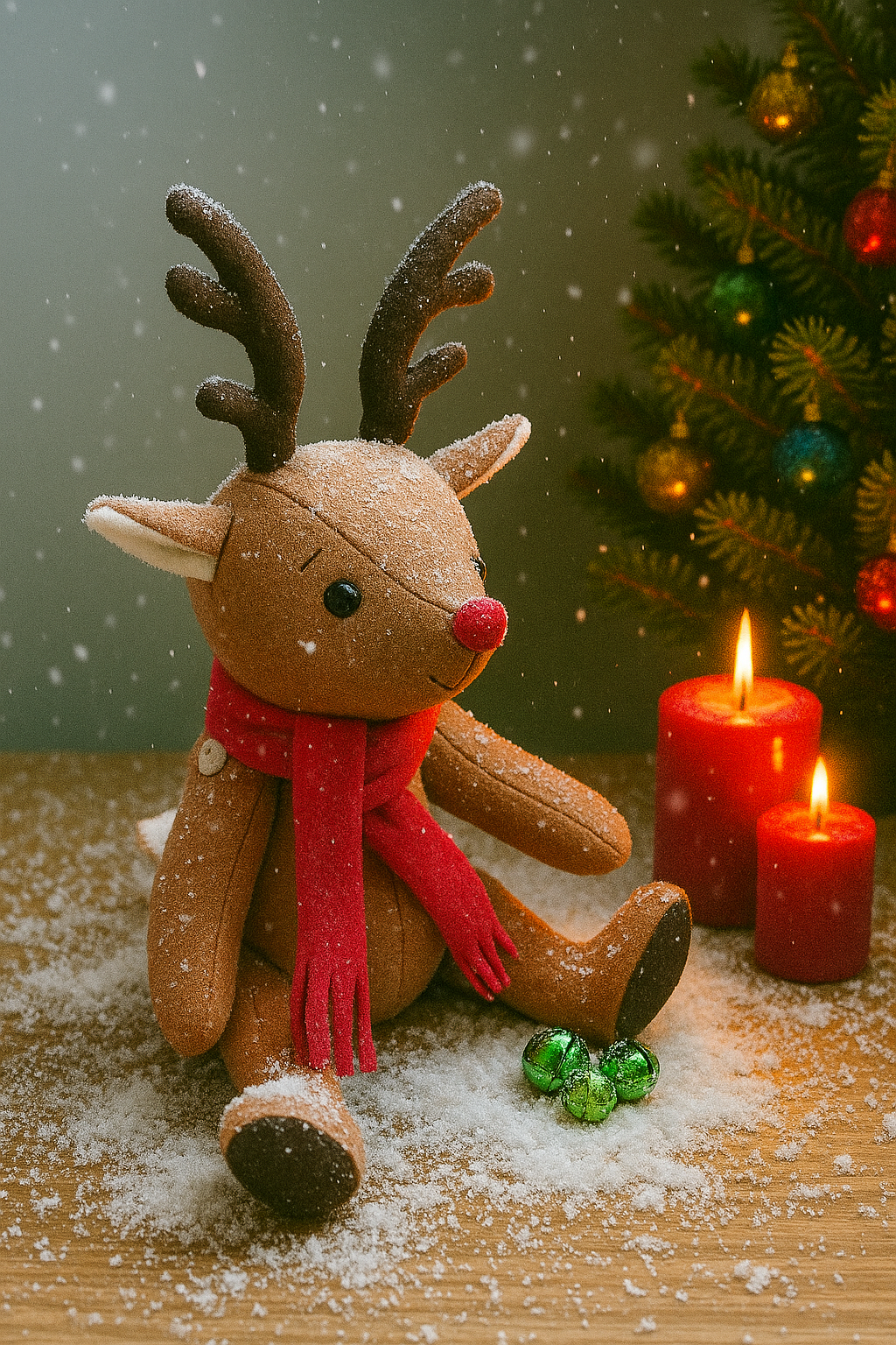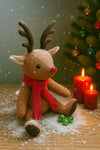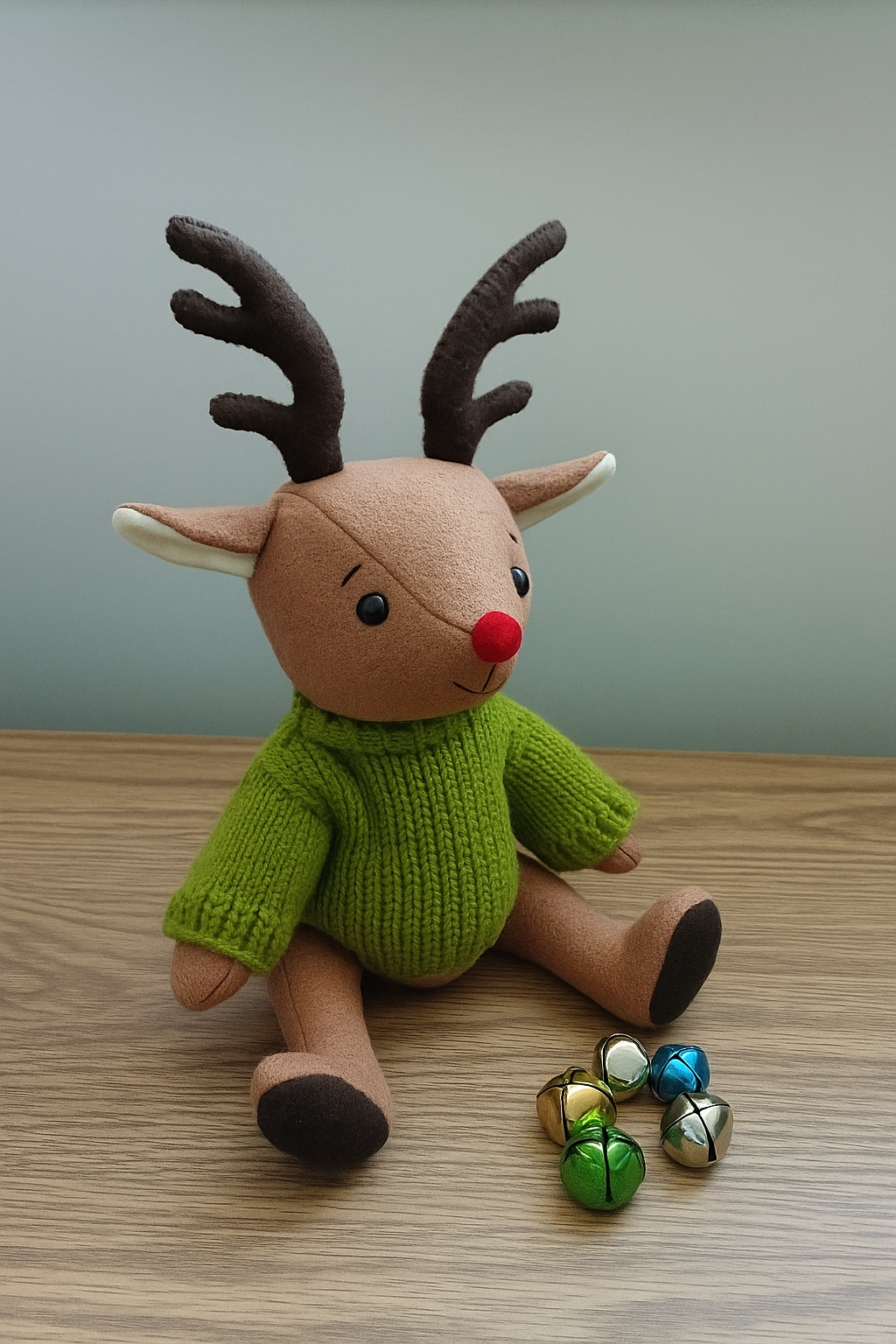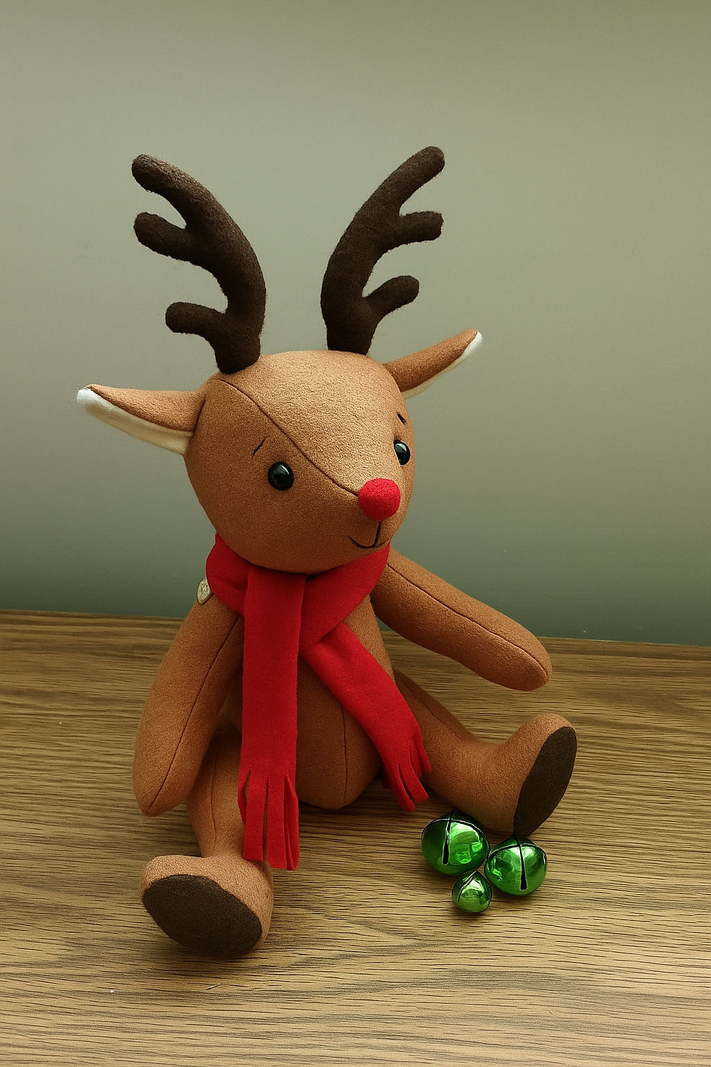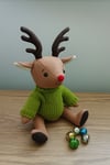 Dennis is a cute little reindeer made here in a wool mix felt , he stands 10 inch high, his arms and legs are button jointed, he can be machine stitched or by hand