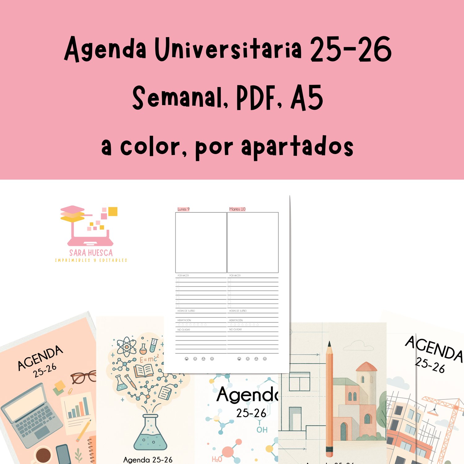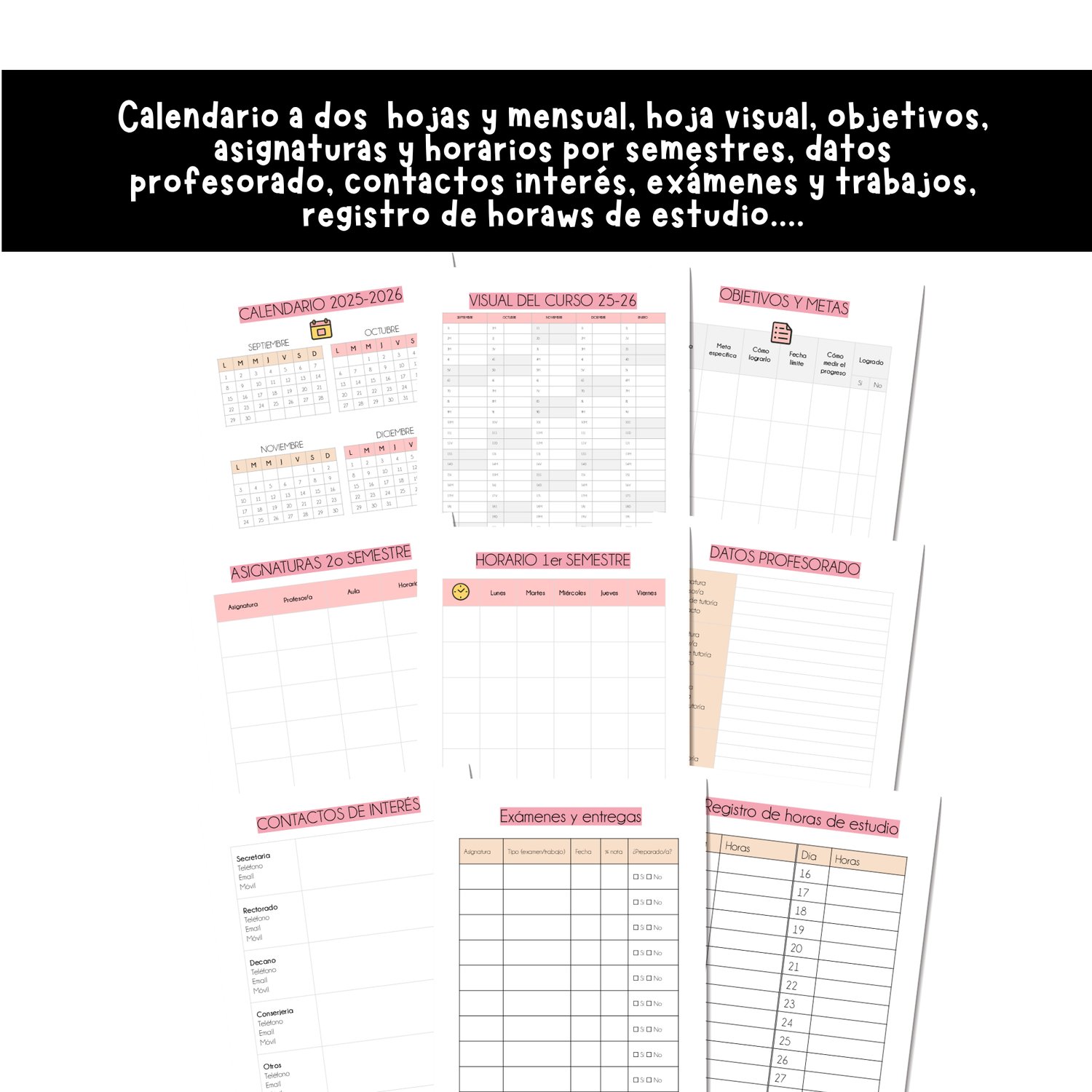 Agenda universitaria 2025–2026 por apartados| PDF imprimible a colo | A5 vertical | Planificador académico 2 días por hoja