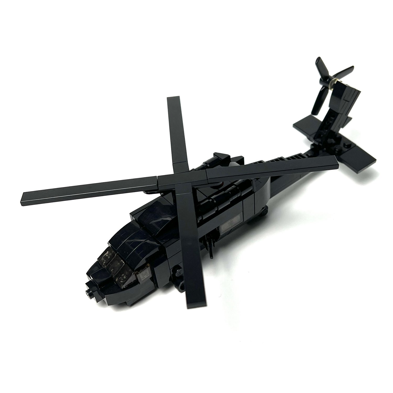 Our brick built version is made in roughly 1:90 scale and is compatible and playable with nano soldiers, and you can fit a few inside the body of the helicopter to simulate operation of side door weapons. The main rotor does spin and it stands on three wheels.