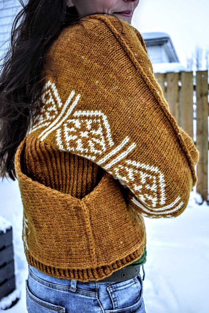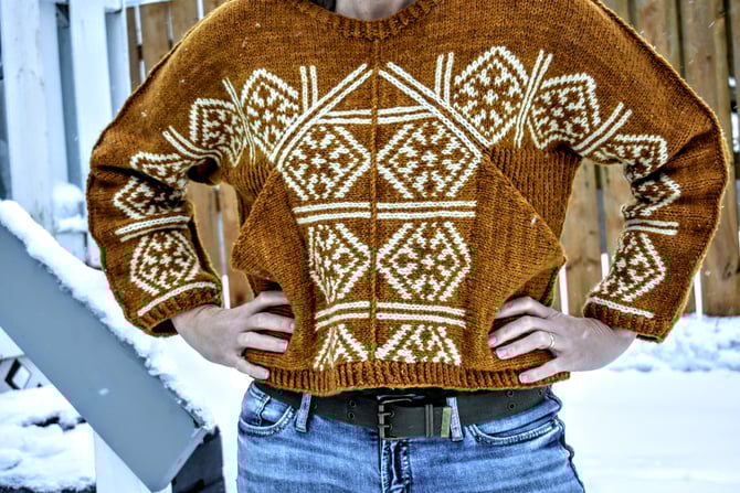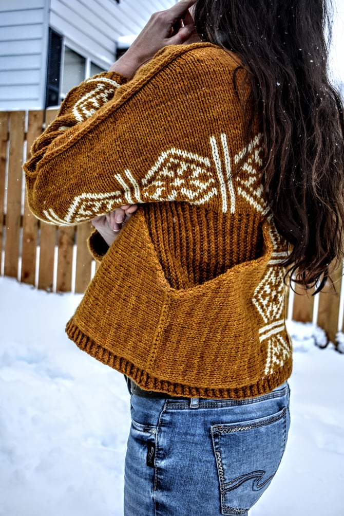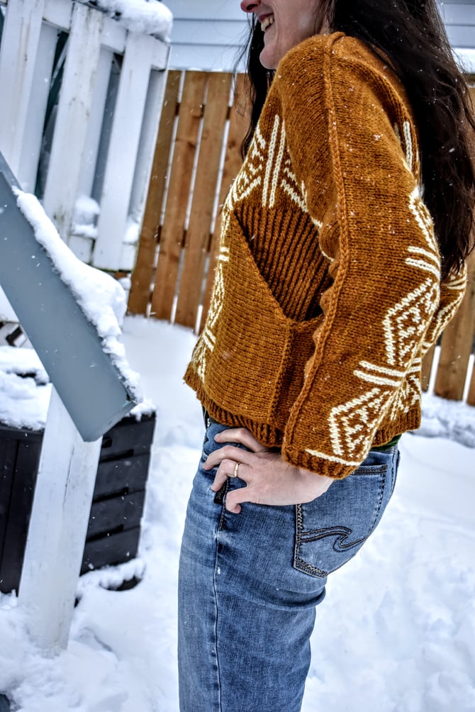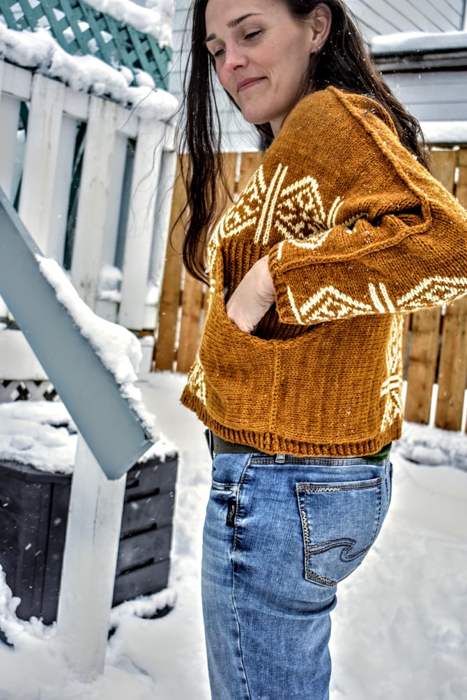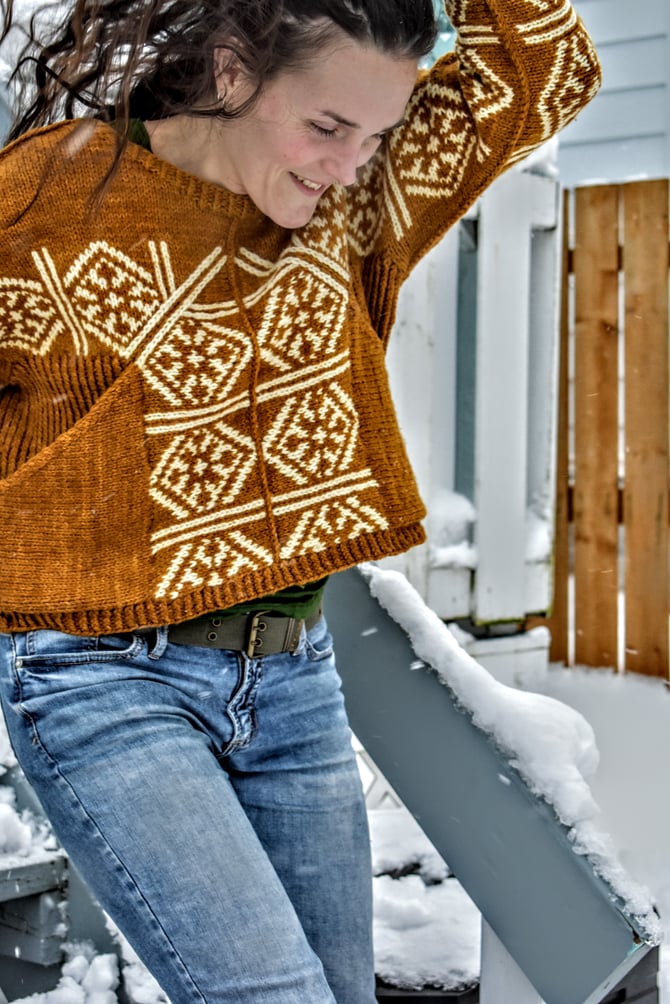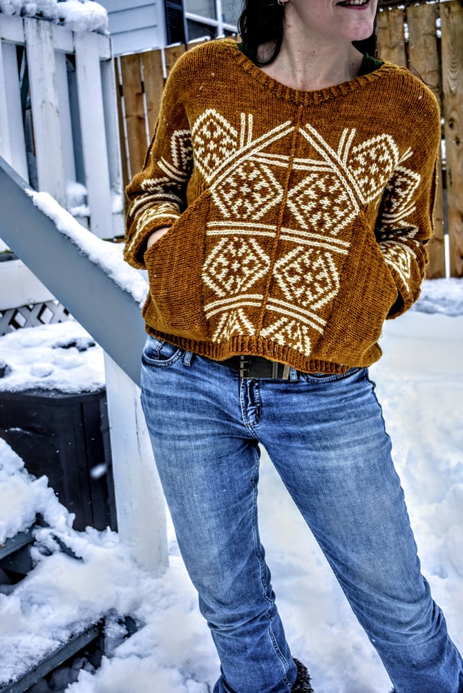 Stepaside for some bold, statement pockets and colourwork on this snuggly aran weight pullover. The Stepaside construction is worked top down, and all colourwork is knit in the round, mitered and steeked. After the body is complete, the pockets are knit sideways and joined with a 3-needle bind-off. A surface single crochet is worked along the picked up stitches at the top of each shoulder/sleeve for extra reinforcement. Cuddle up in some fun and don’t mind the double takes.