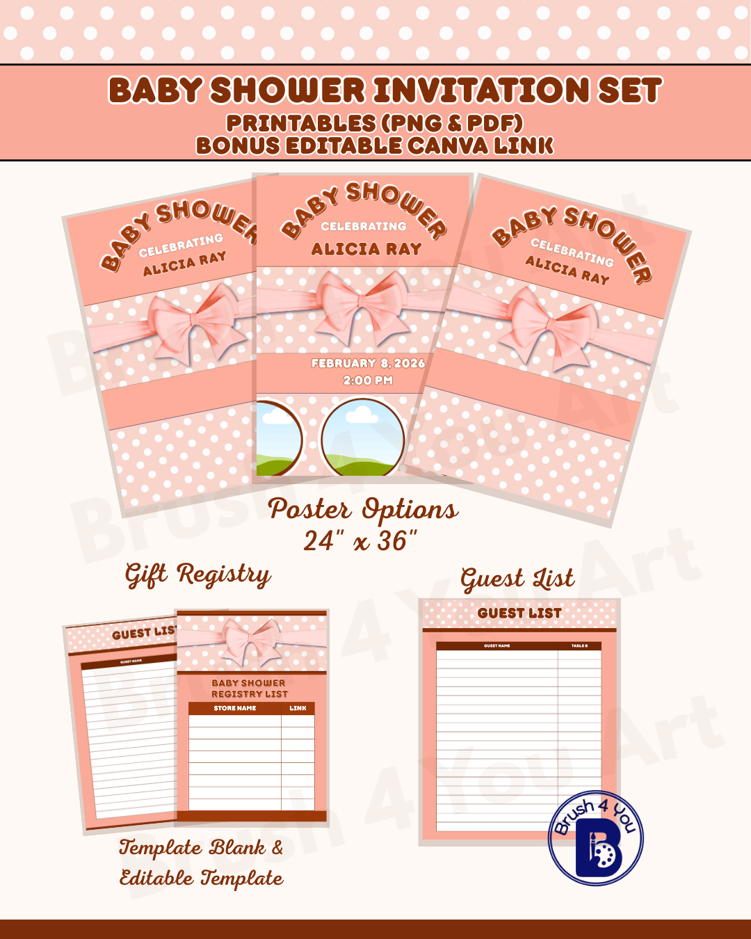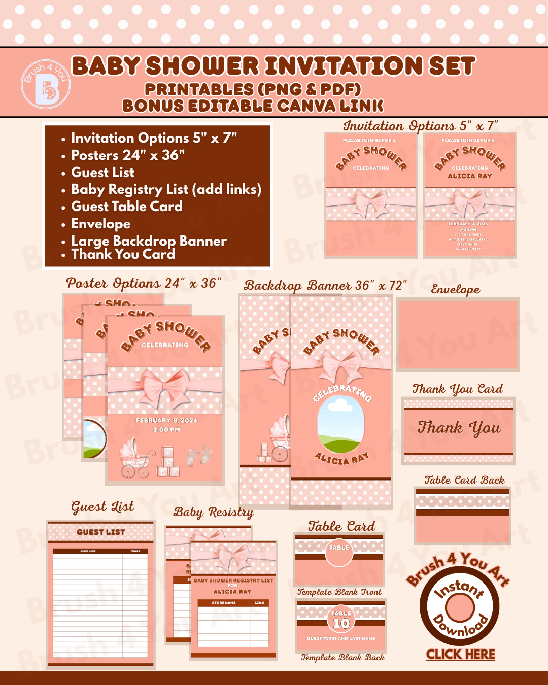 Included in this set is options for an invitation, guest list, baby registry list (make it virtual and add an active link for people to click), guest table card, thank you cards. This set has so many options they are instant download png and pdf files and are also editable in Canva.