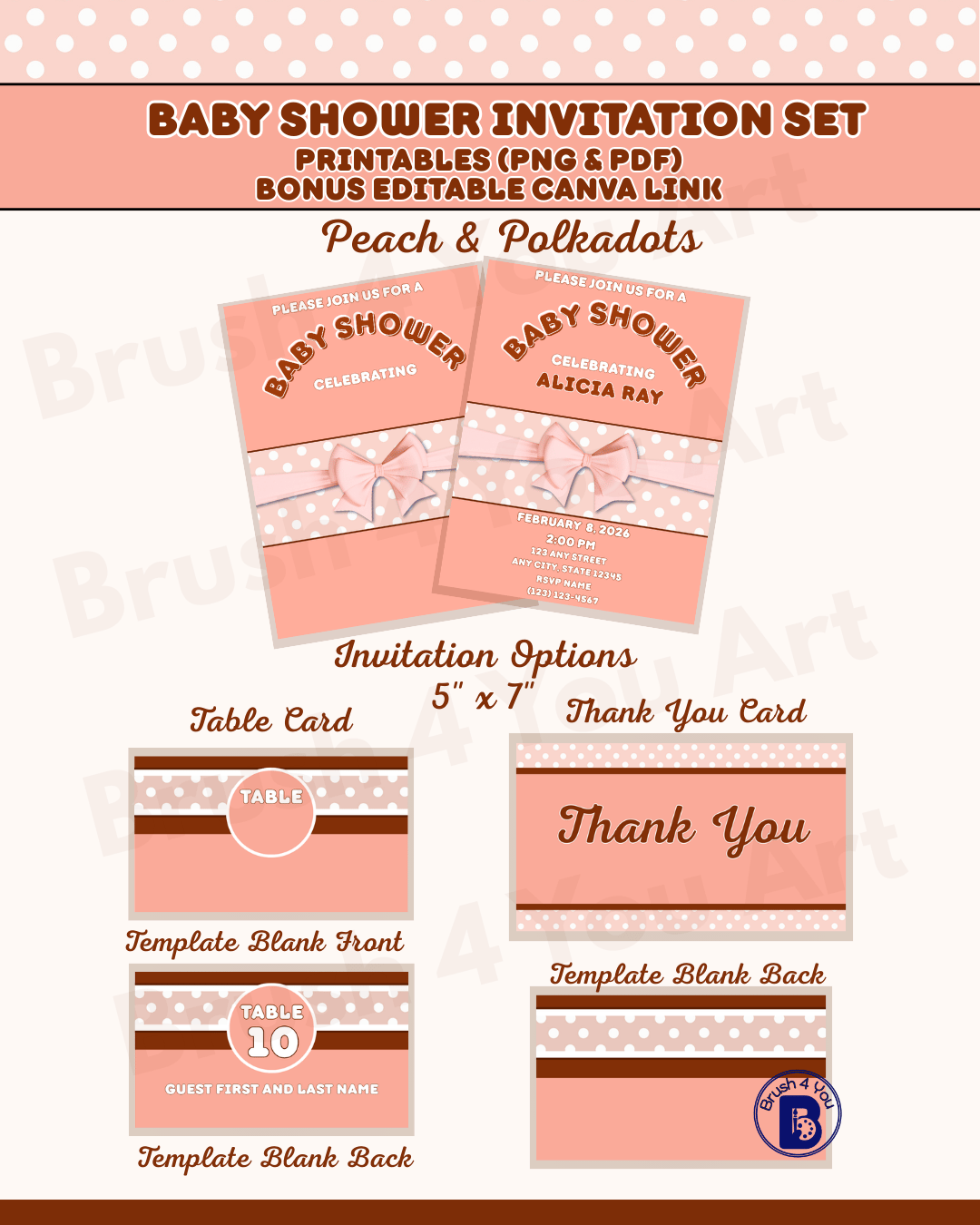 Baby Shower Invitation Set in Peach and Polkadots, has all you need to plan and have a successful Baby Shower.