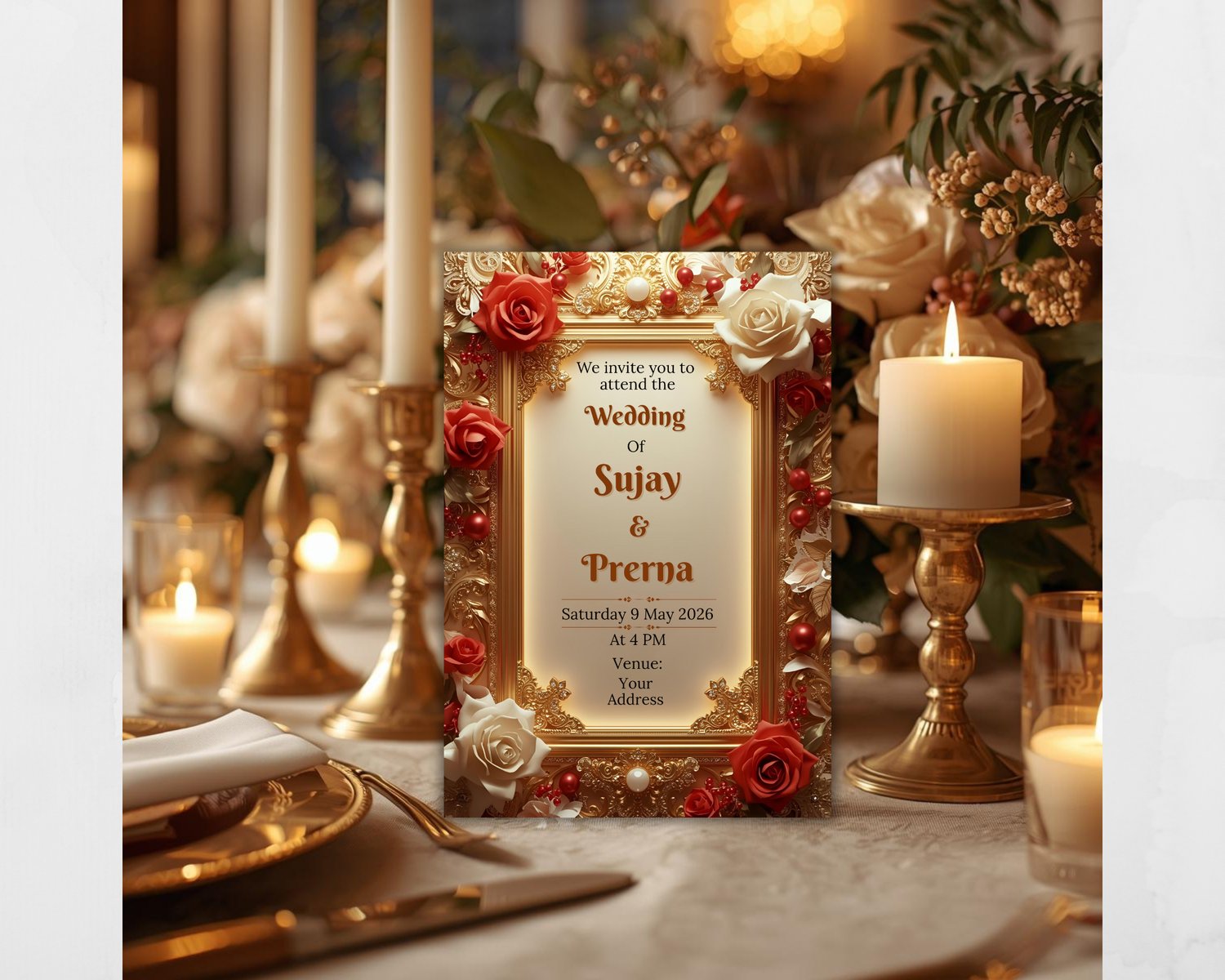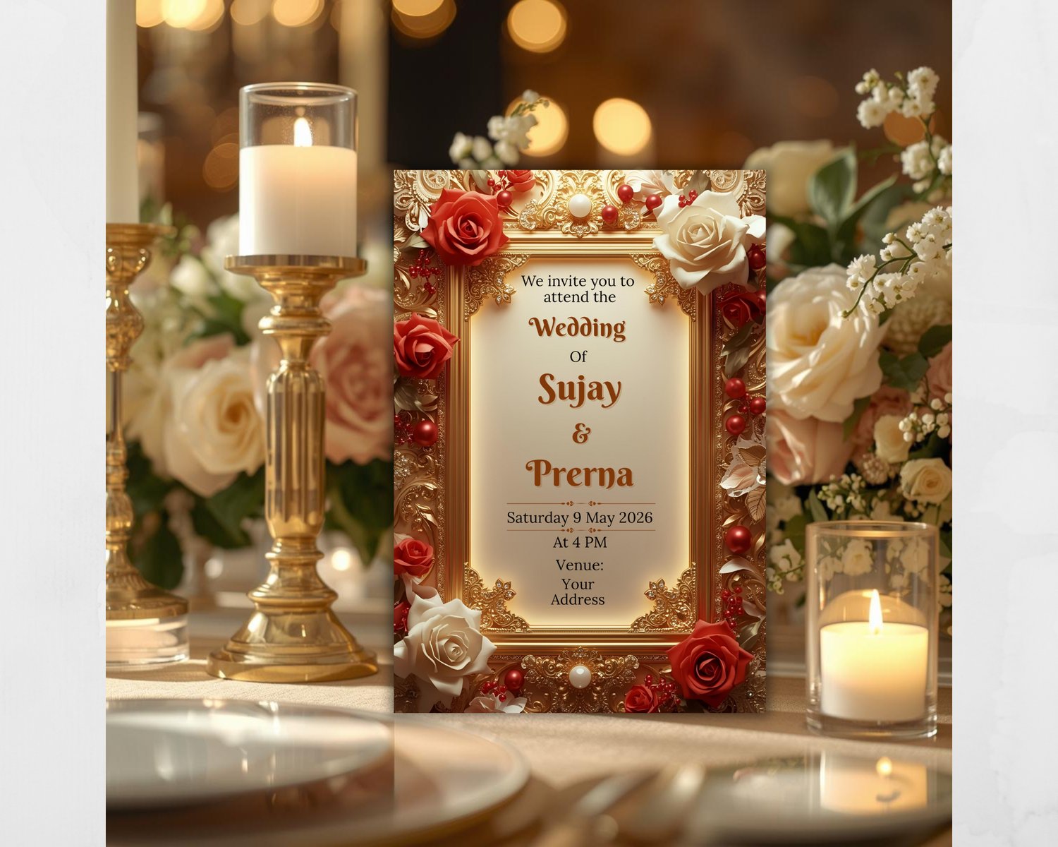 This invitation is perfect for couples who want a royal, classy, and sophisticated wedding invite. The design is fully editable, allowing you to personalize names, dates, venue, and details easily.
