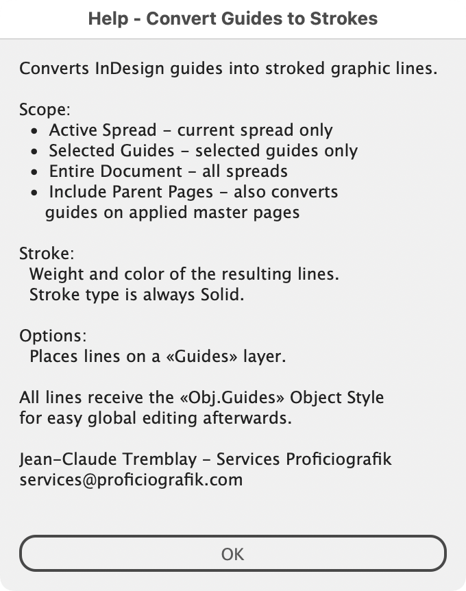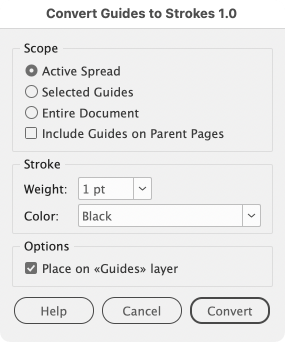 Converts guides into editable stroke objects — from a selection, the active page, or the entire document. Options include processing guides on Parent Pages and placing results on a dedicated "Guides" layer. An Object Style named «Obj. Guides» is automatically created, allowing easy global editing afterward.