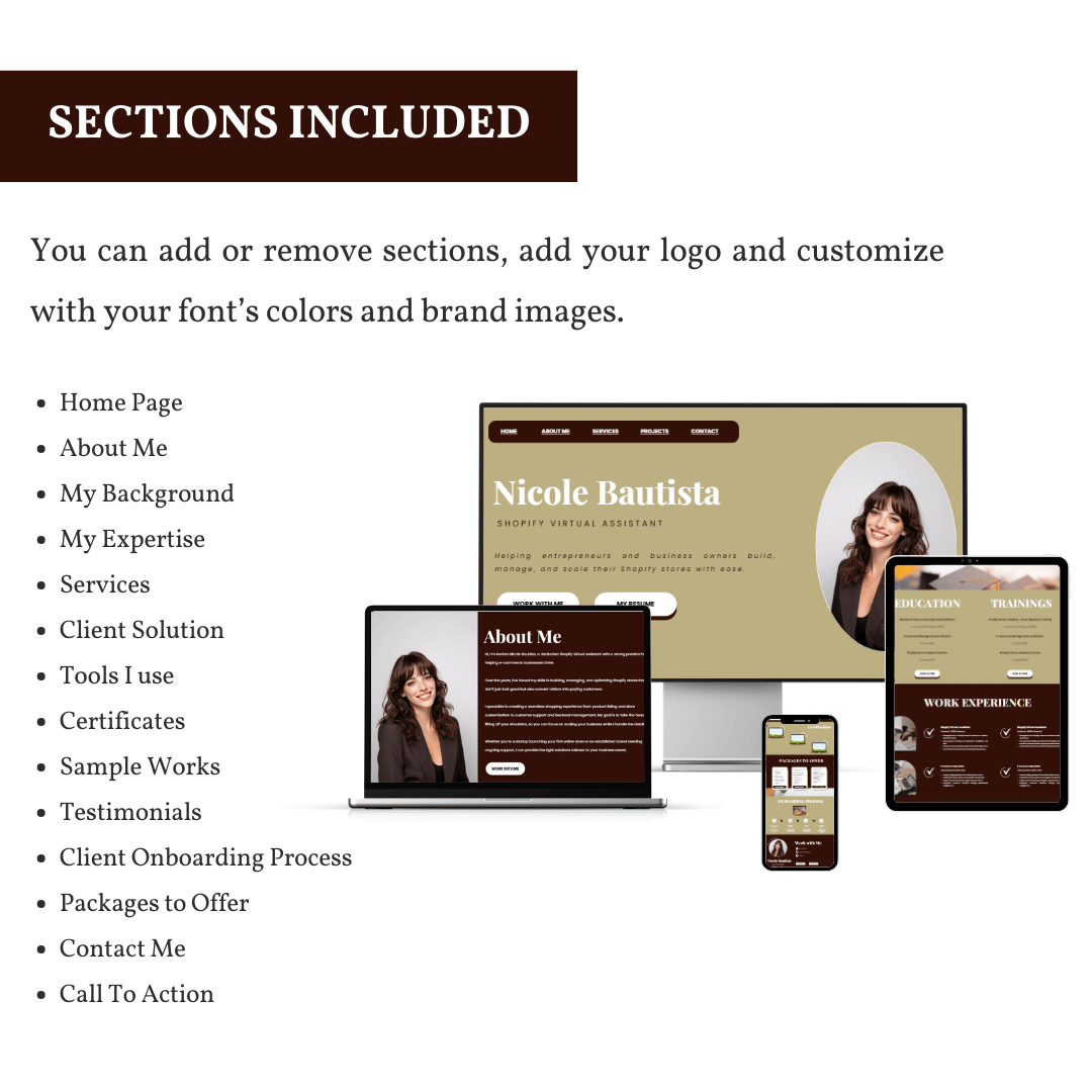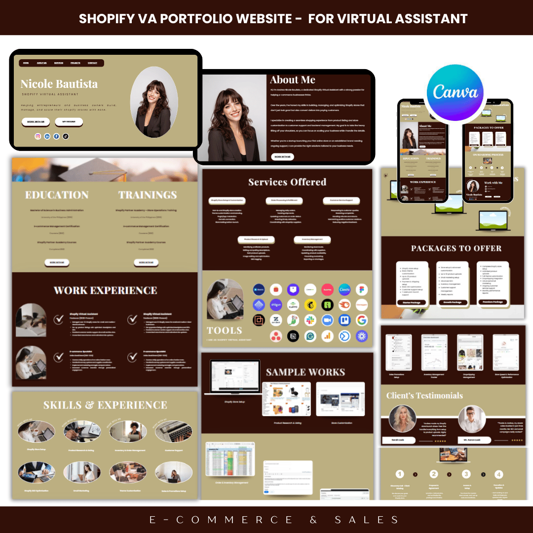 🔹 Pages: Home, About, Education, Work Experience, Services, Skills & Expertise, Tools, Work Samples, Packages, Certifications, Onboarding Process, Testimonials, Client Solution, Contact CTA.