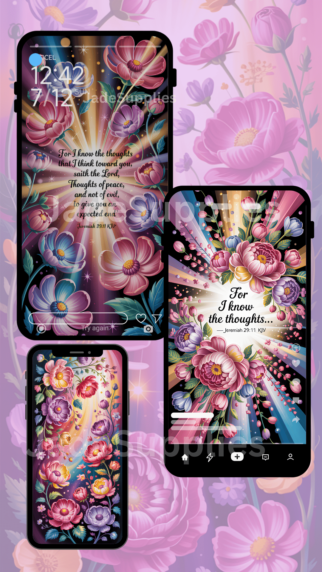This beautiful 3-piece wallpaper bundle features vibrant florals, radiant light beams, and uplifting KJV scripture, designed to fill your day with peace, hope, and encouragement every time you unlock your screen.