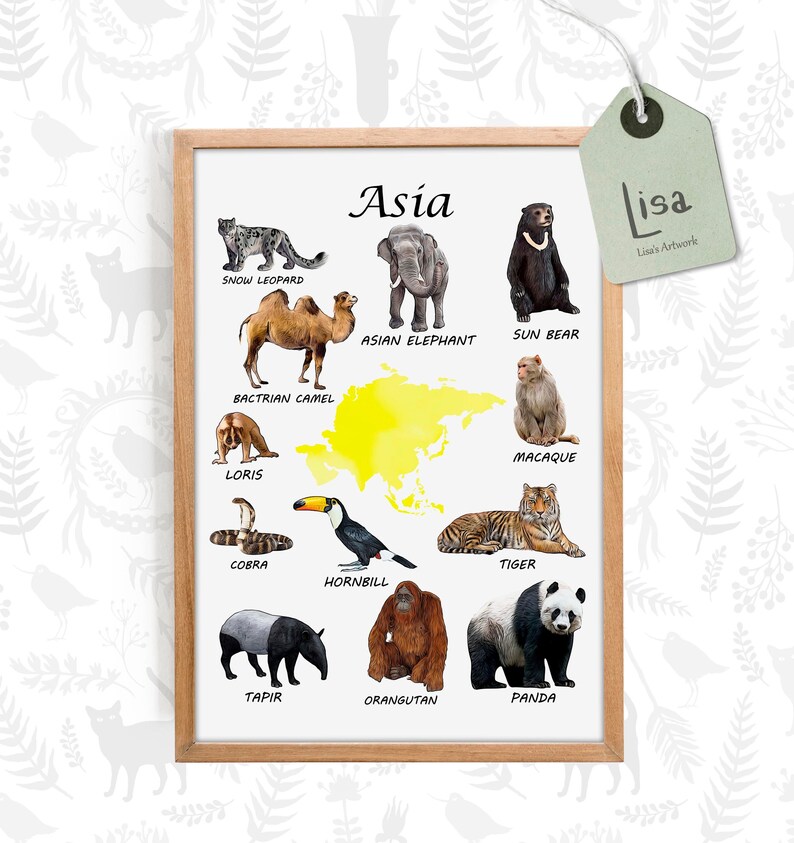 Asia continent montessori classroom posters, classroom decor, playroom decor, montessori printable, homeschool, animal art print