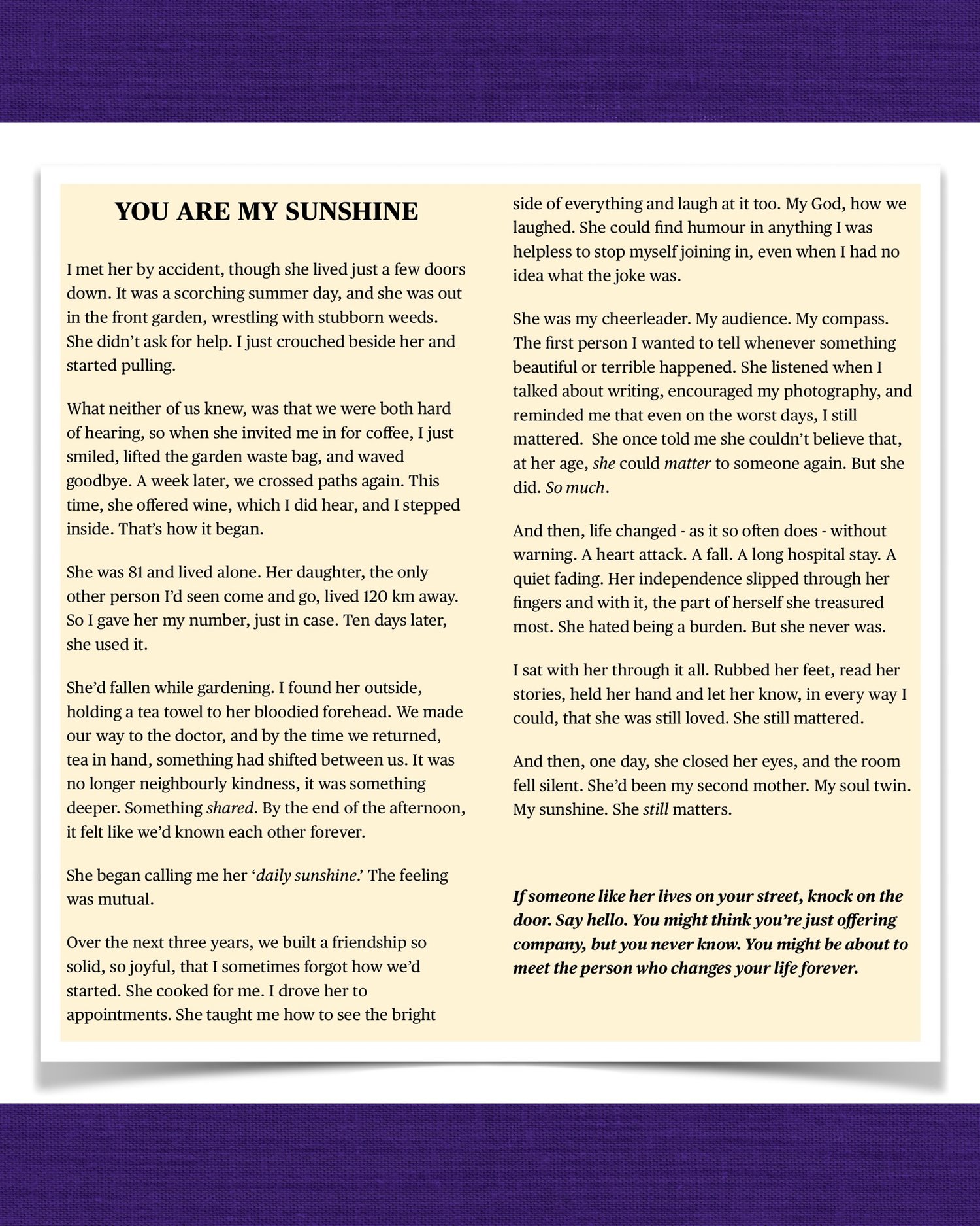 Real-world stories stitched from moments of noticing - on trains, in waiting rooms, in the quiet gaps between people. These stories don’t shout. They sit beside you gently and say: